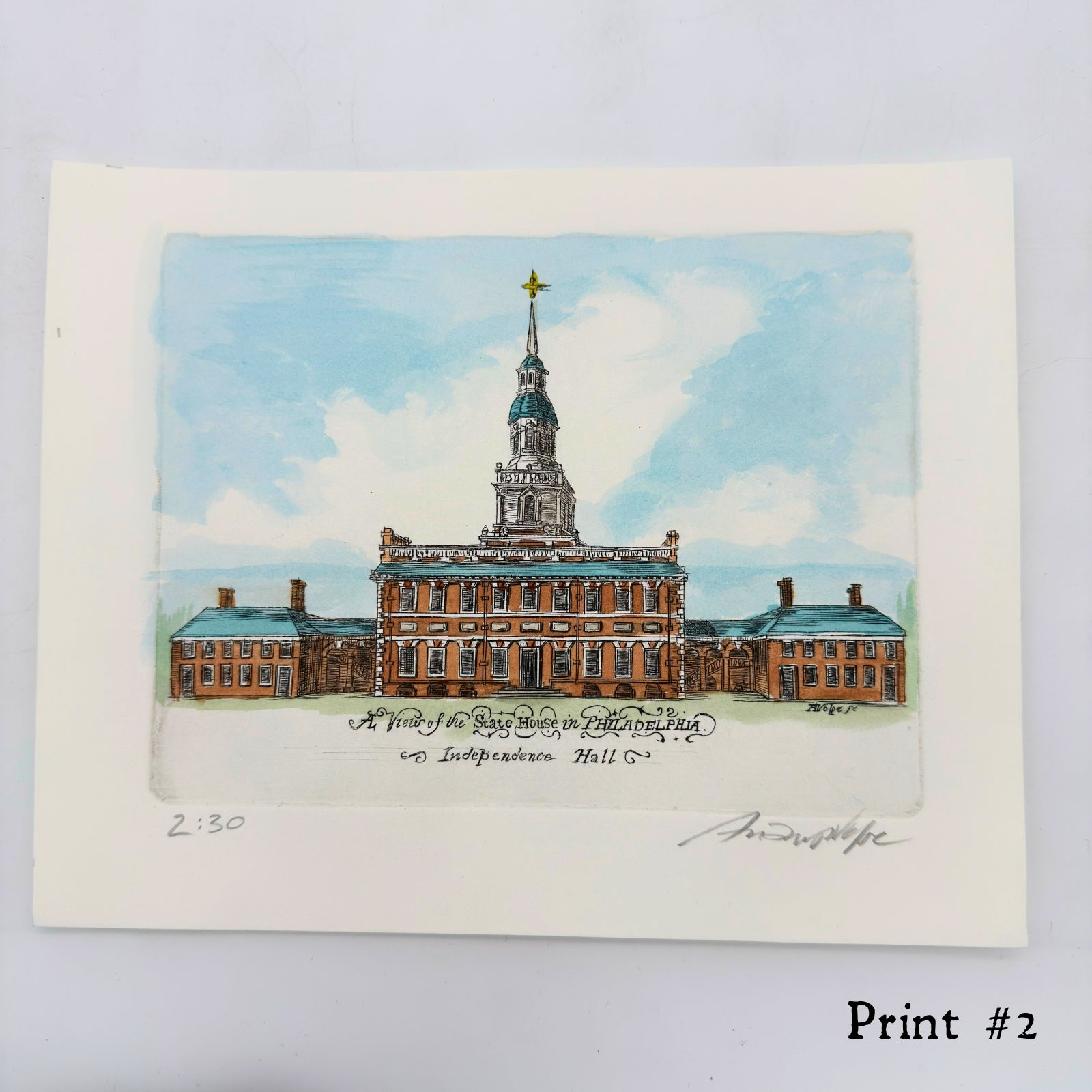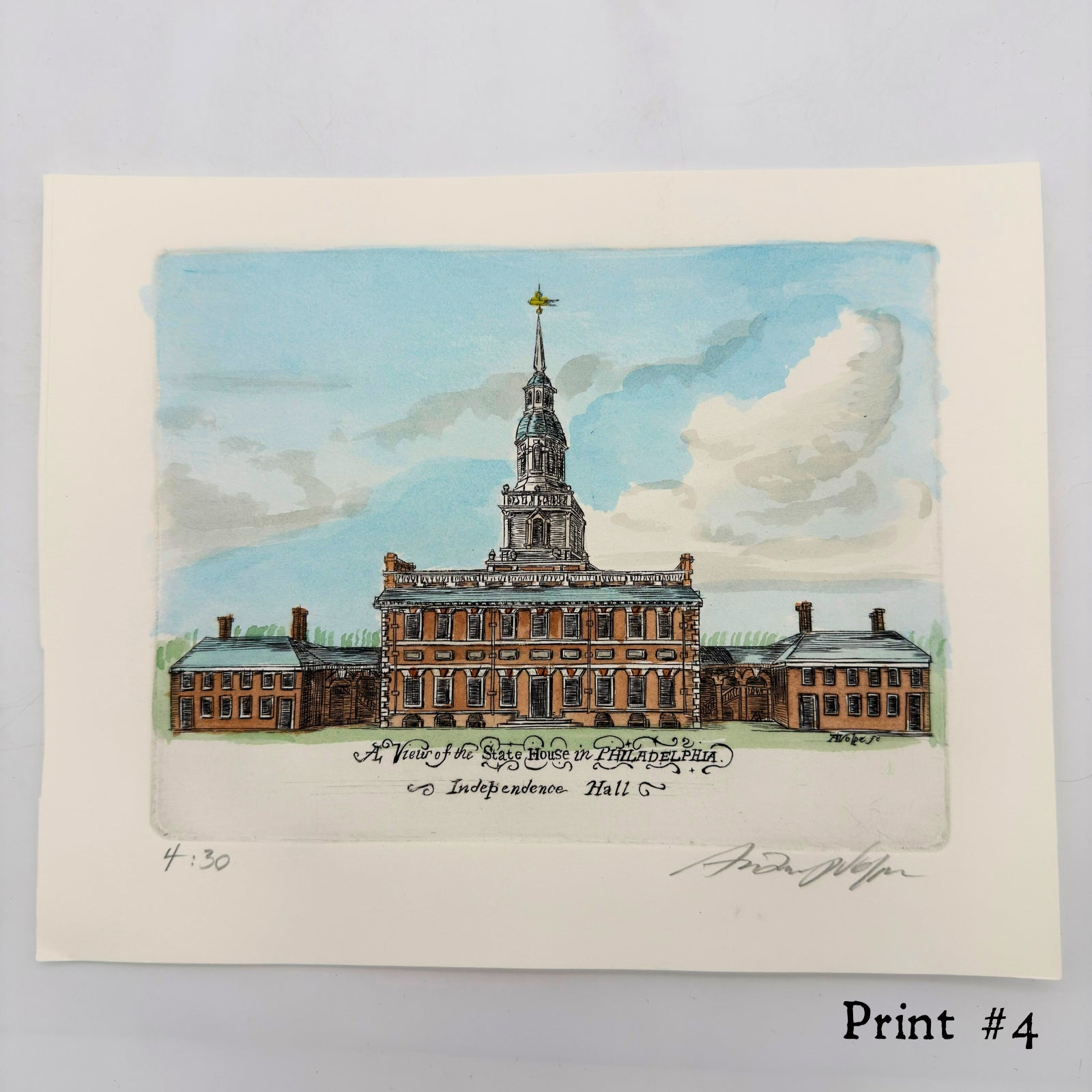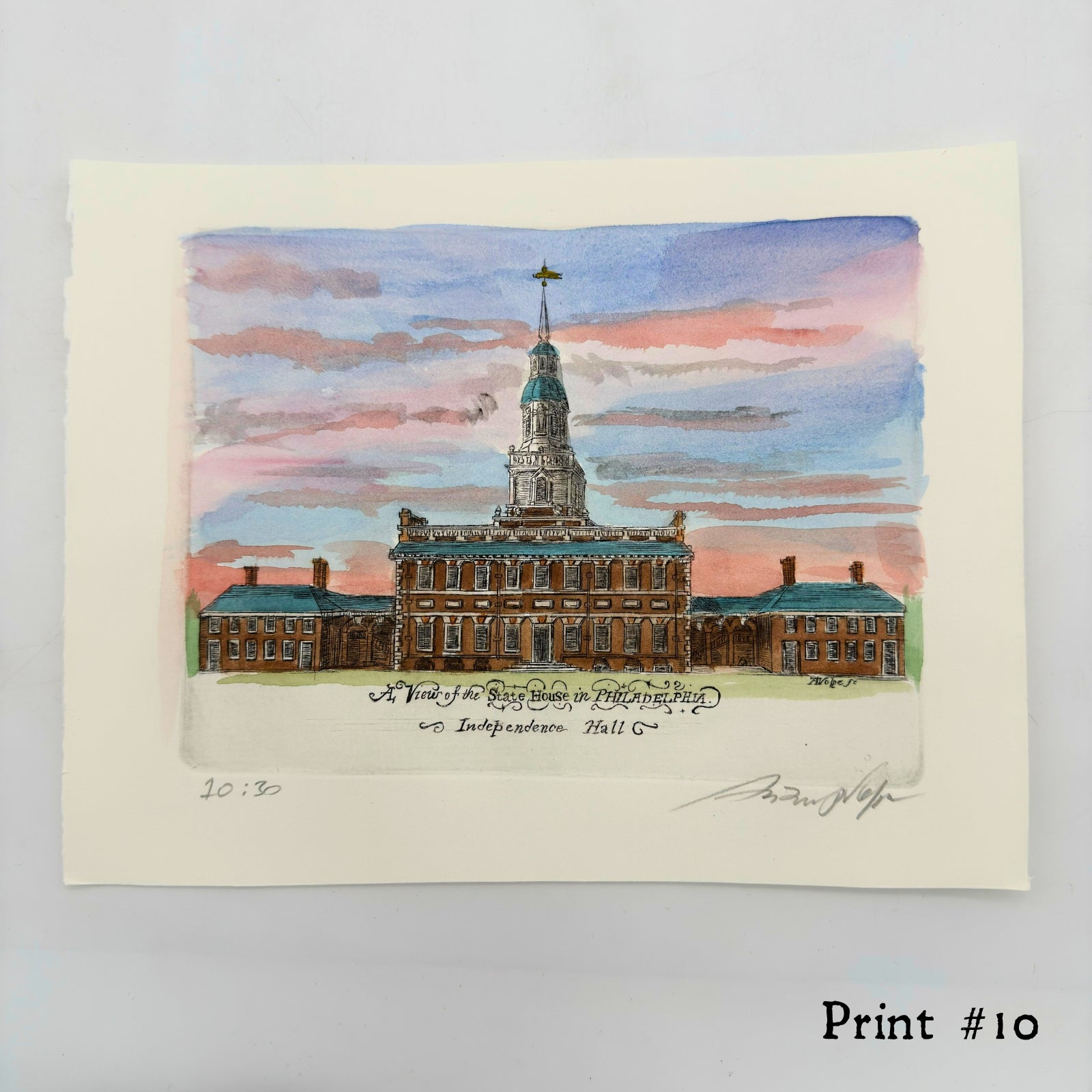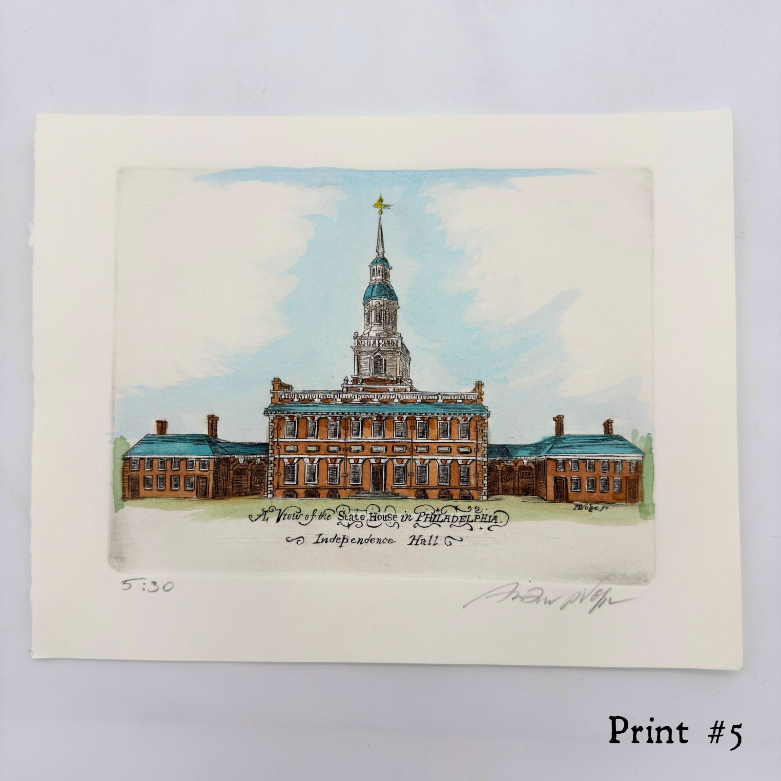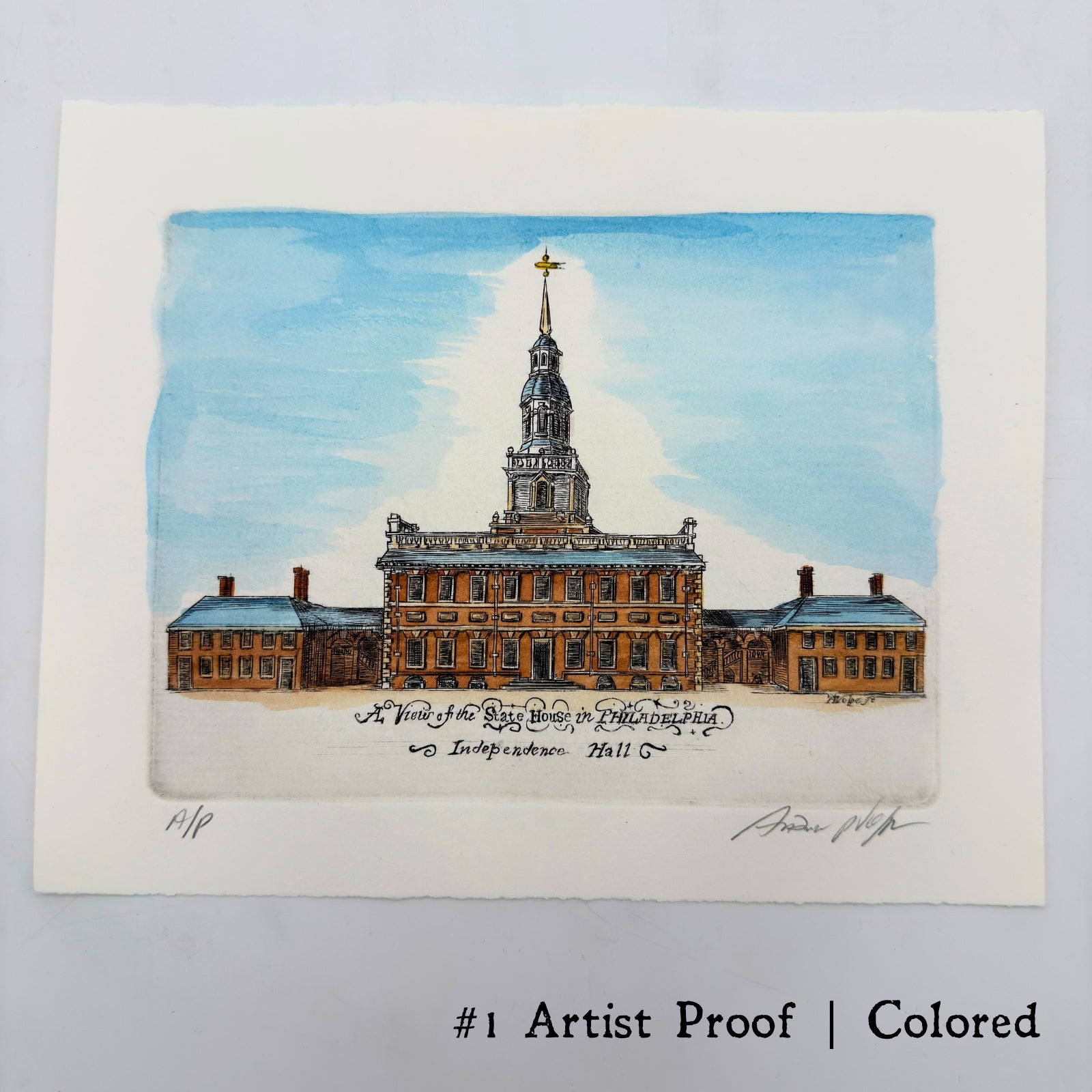 Hand-engraved print of the Philadelphia State House known today as the Independence Hall. Created by historical artist and engraver Andy Volpe.