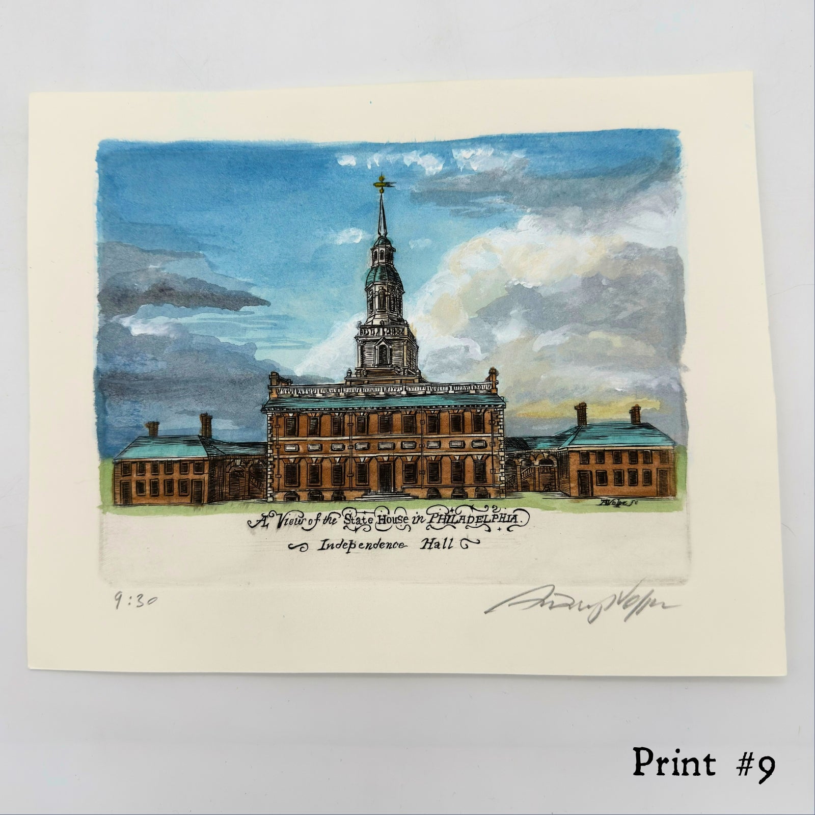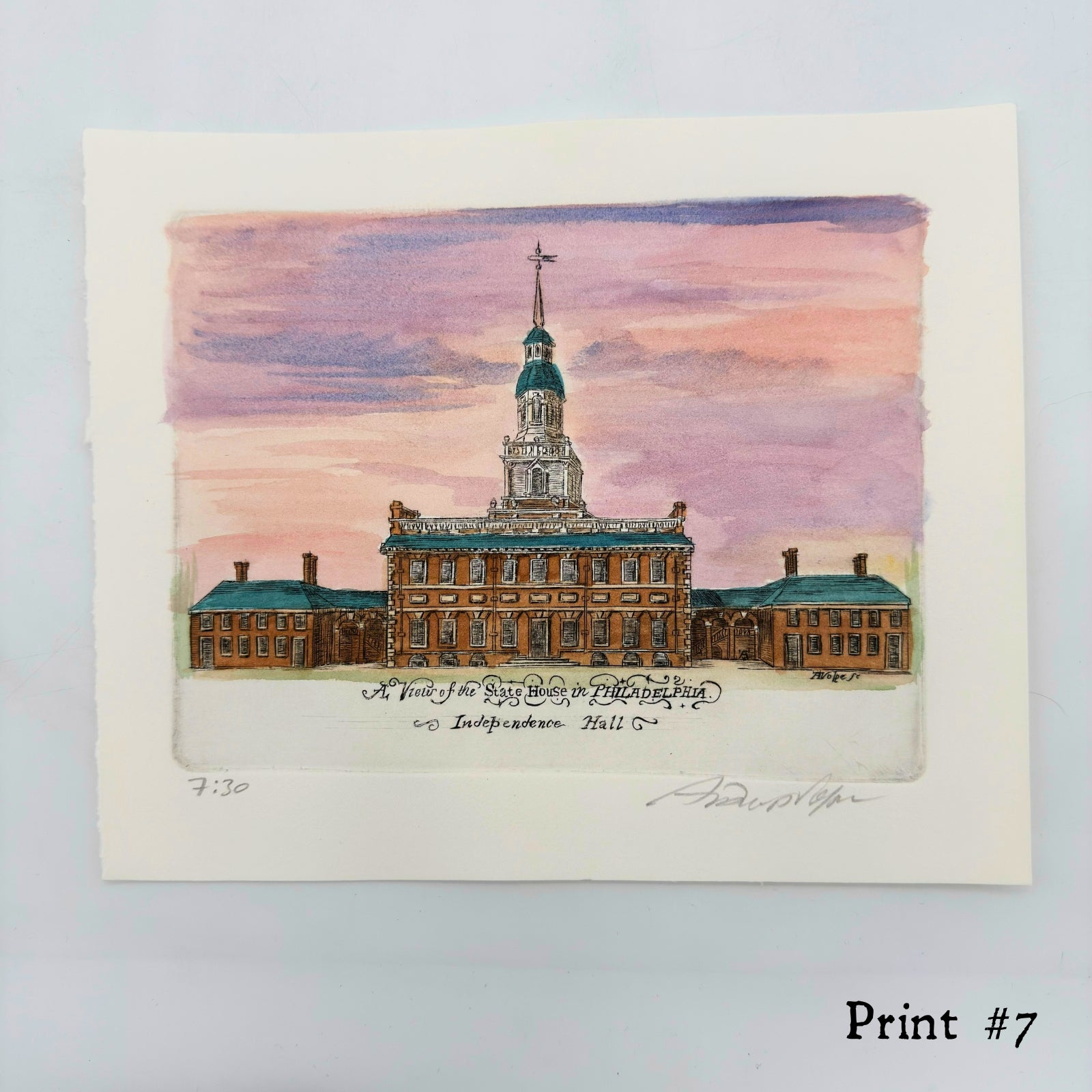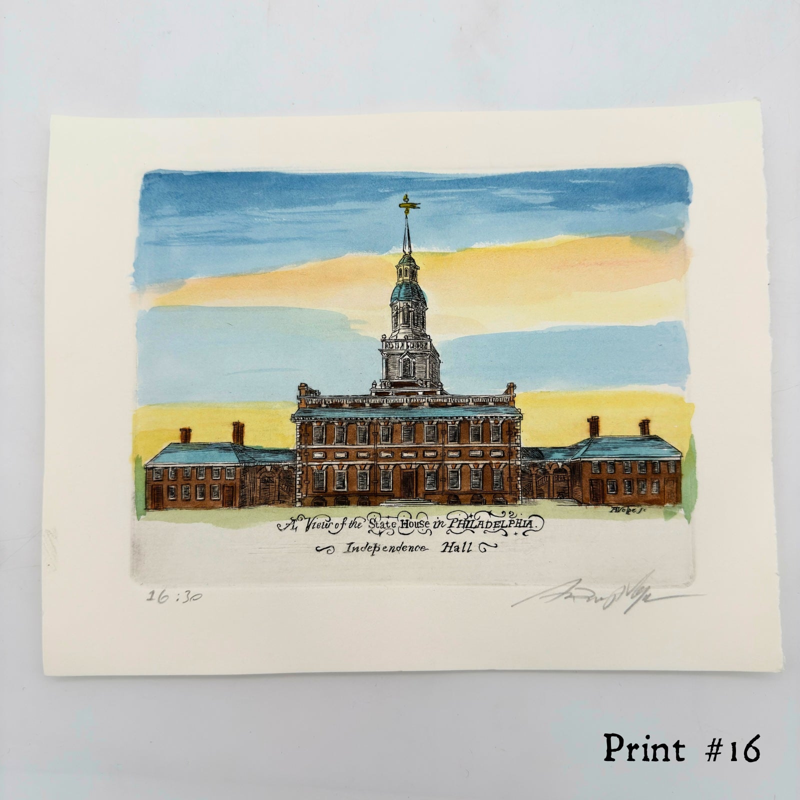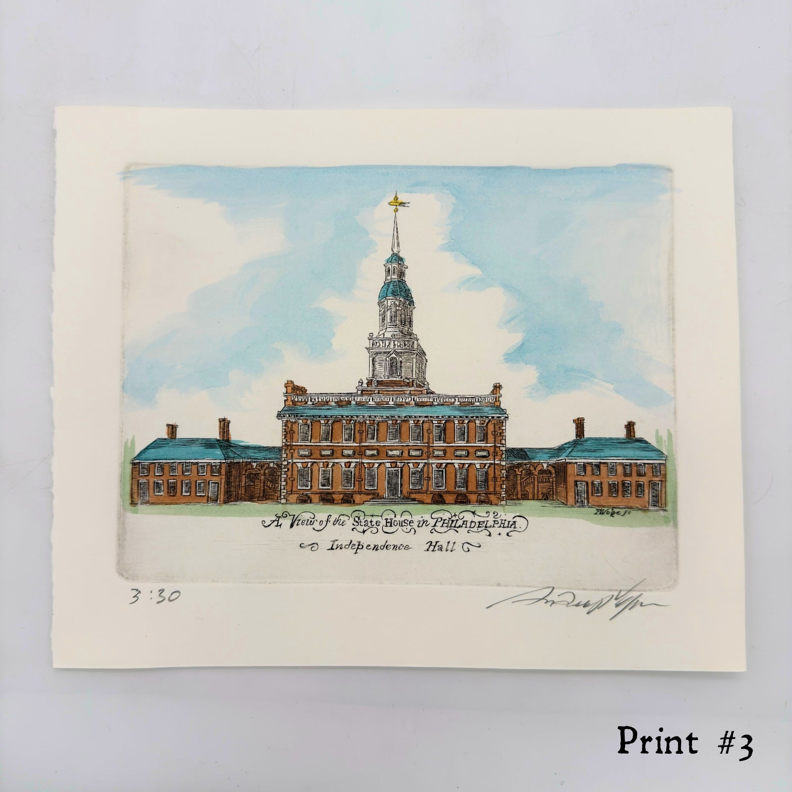 Hand-engraved print of the Philadelphia State House known today as the Independence Hall. Created by historical artist and engraver Andy Volpe.