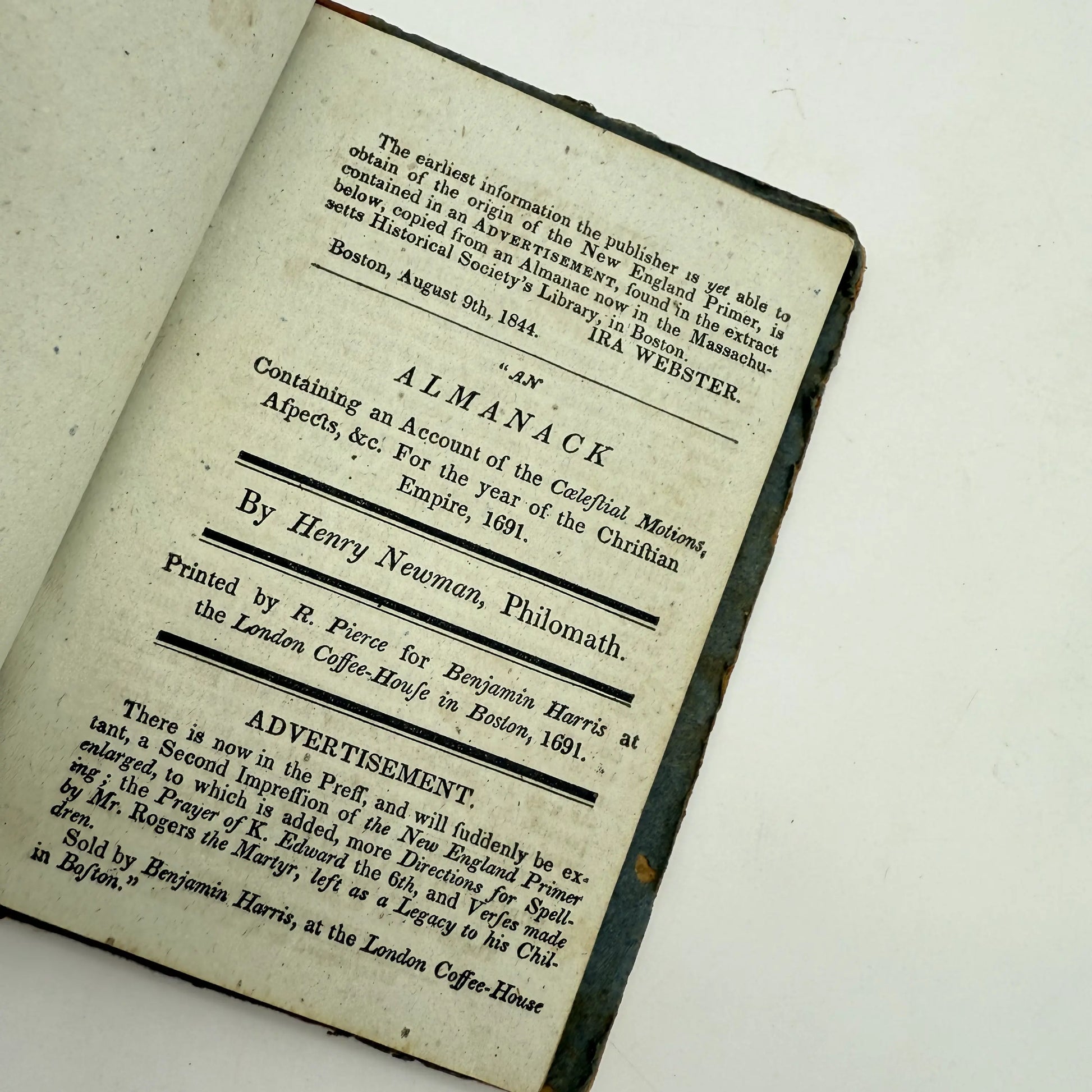 First published by Benjamin Harris in 1686 in Boston, the book was found in many homes along with the Bible. Modeled after British primers that had been created to educate the illiterate during the Reformation, this primer was nicknamed "The Little Bible of New England" and was used in early colonial schools such as Boston Latin School. Versions varied locally with the selection of lessons, and publisher and bookseller advertisements were included in many."