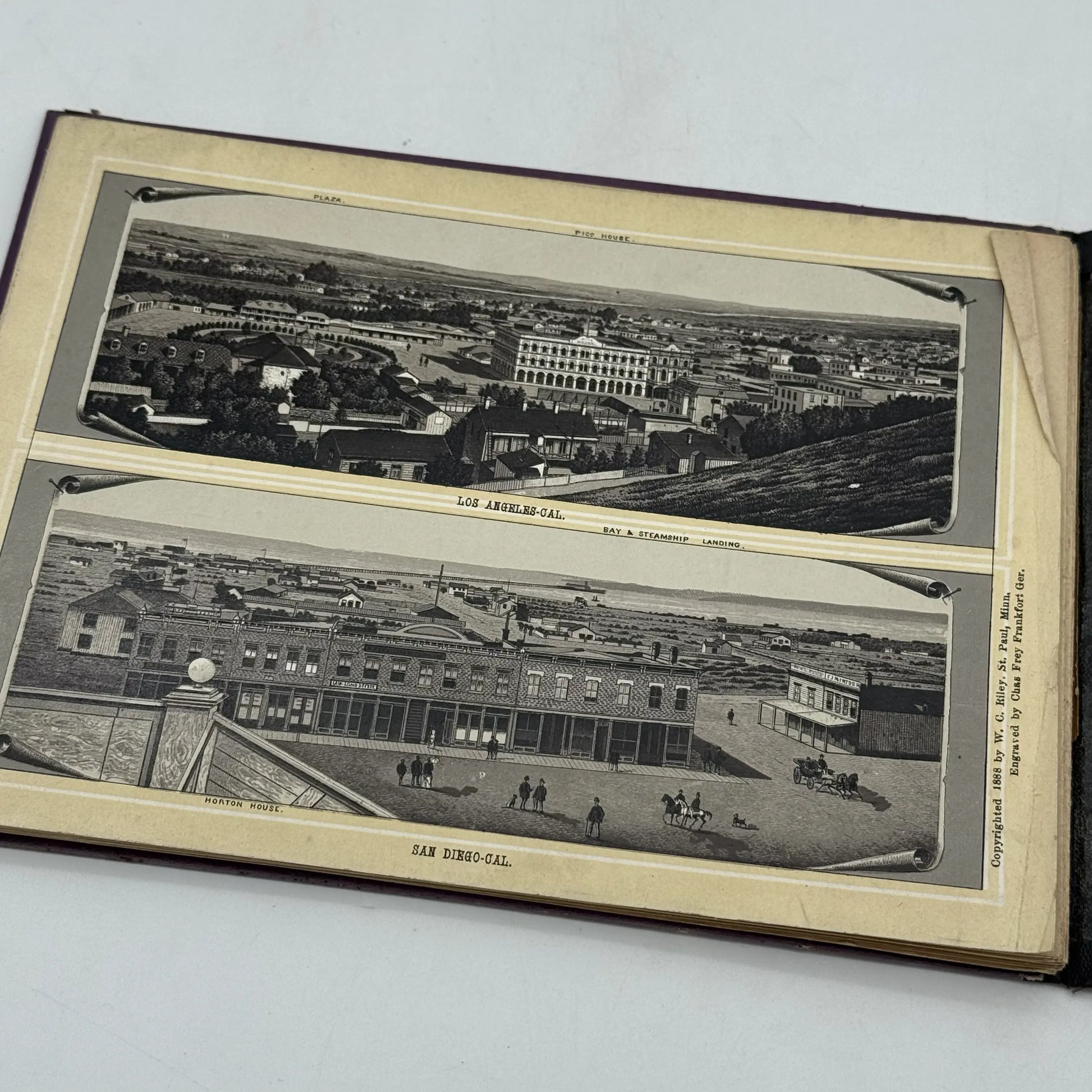 The 1888 Northern Pacific Tour panoramic is a rare oblong-format promotional album issued by W.C. Riley in St. Paul, documenting the Northern Pacific Railways route from the upper Midwest to the Pacific Coast and Alaska.
