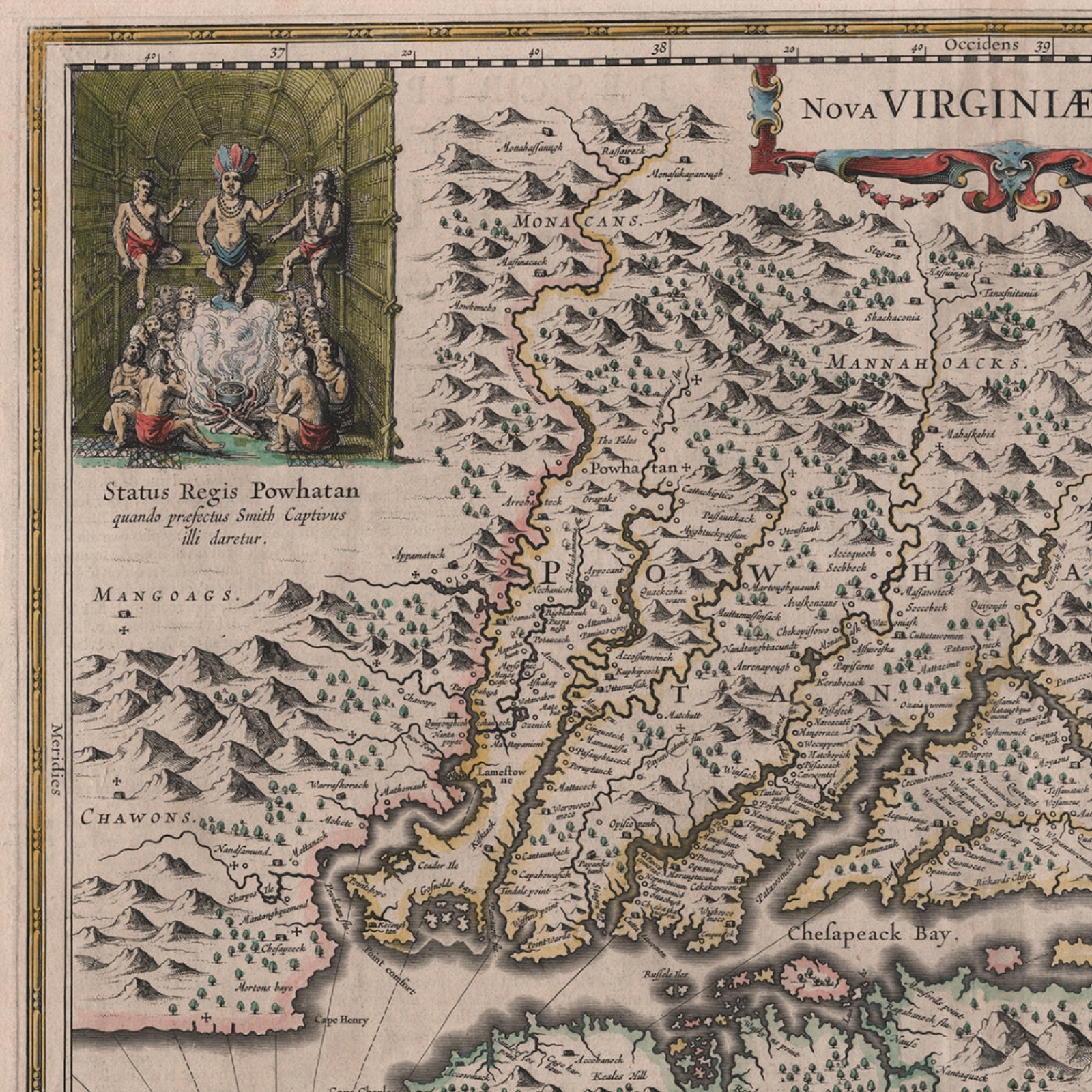 "One of the more popular legends regarding John Smith was is capture and trial before the chief of the Powahatan. Smith was convinced that his liberation had something to do with the youthful daughter of Chief Powahatan, Pocahontas, taking a liking to him. Though this grew into a fictious legend of its own, the truth is more likely that Powhatan saw Smith and his Englishmen as potential allies against the rival American Indian groups, such as the Massawomecks, that were pressing hard against his borders. There are a number of different editions of this map and its publication by various map houses in various states made it the first widely distributed map of the Virginia colony and of John Smith’s important map.