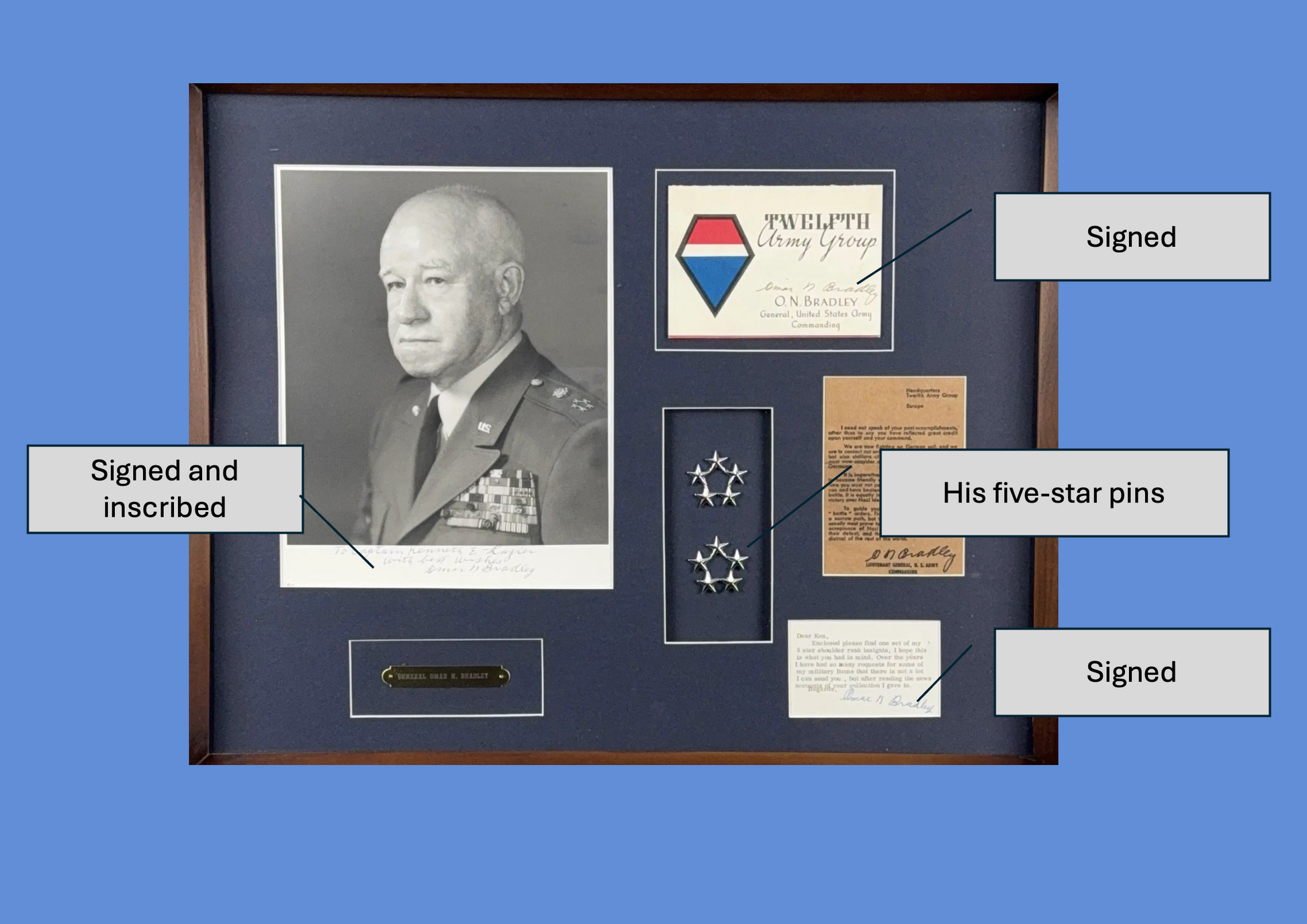 - A signed portrait of General Omar Bradley addressed to Capt. Kenneth E. Lazier. Lazier amassed a large collection of items owned by some of the major military figures in WWII.