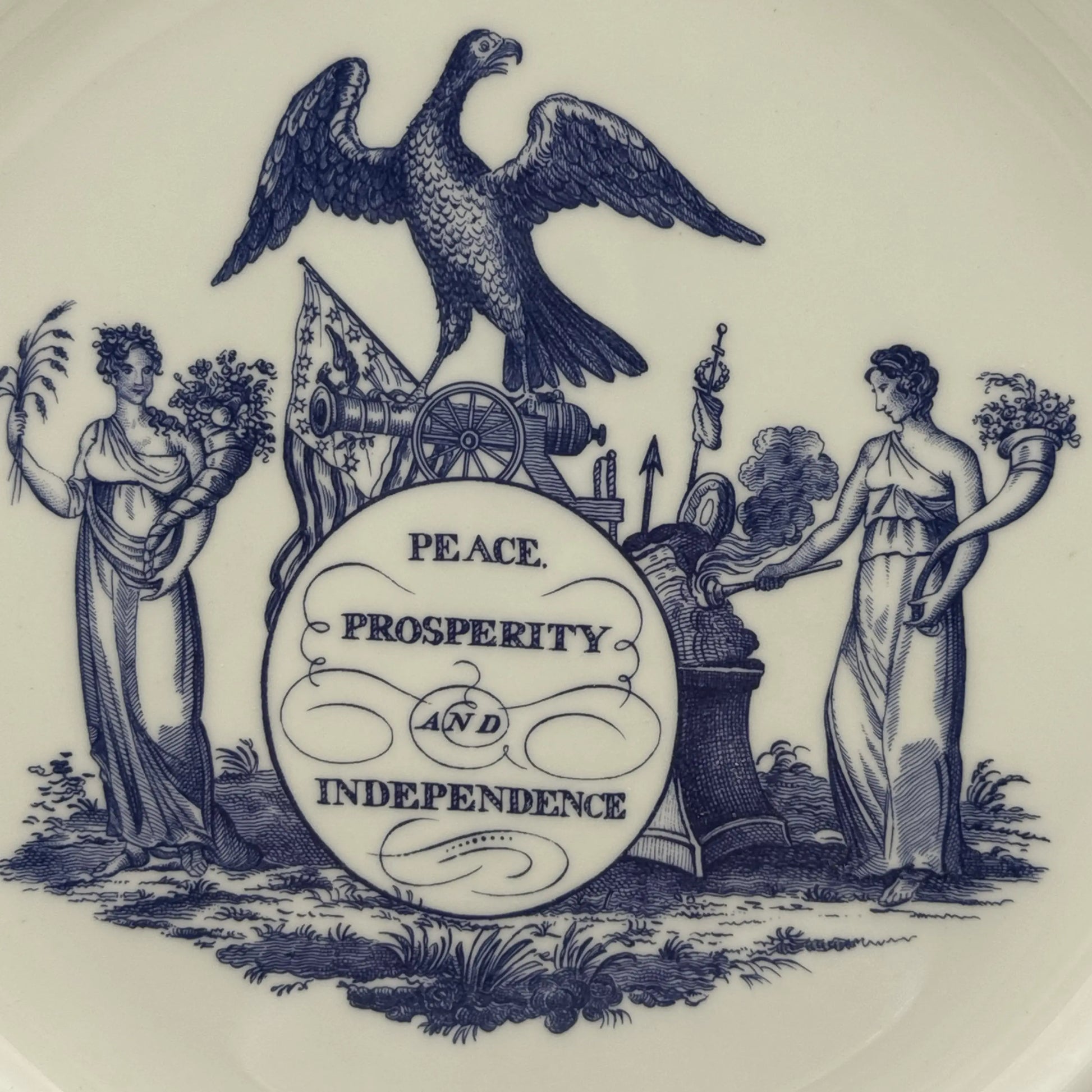 Decorated with a stars and stripes border and artwork surrounding the phrase "Peace, Prosperity and Independence."