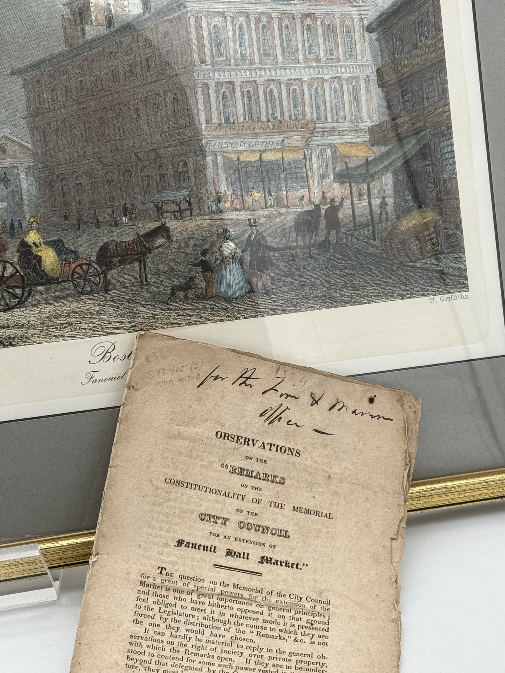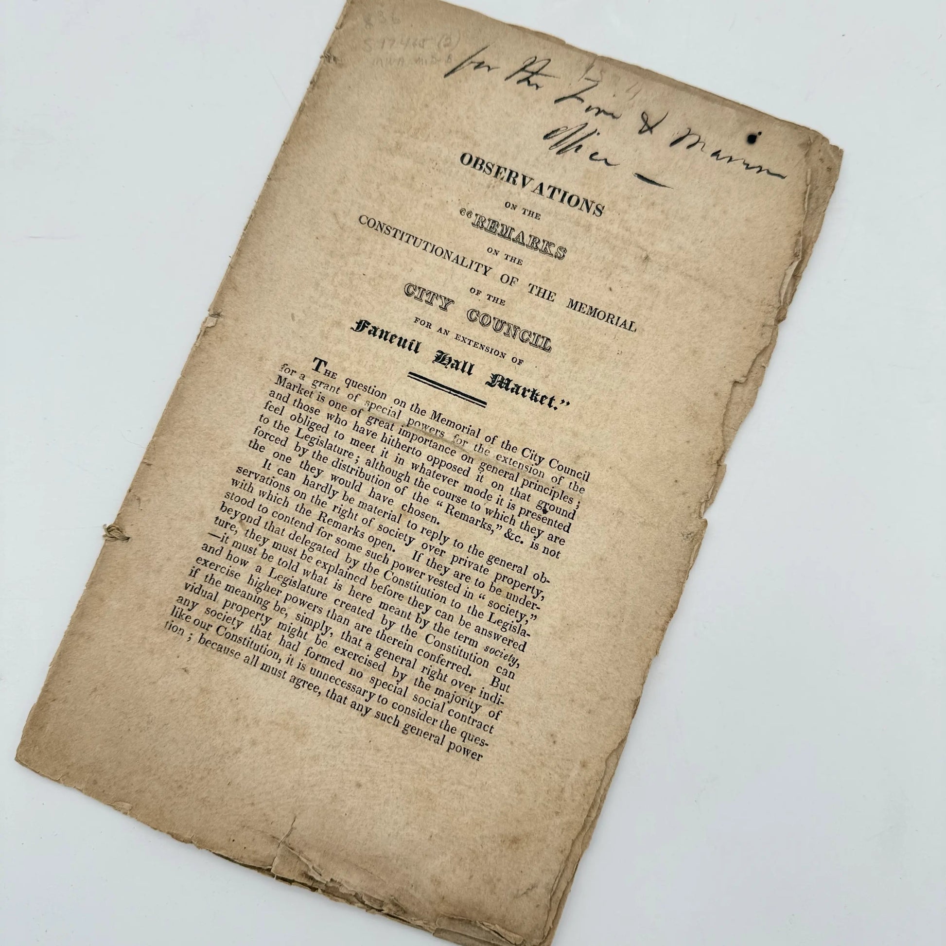 Also includes a historical document, Observations on the "Remarks on the constitutionality of the memorial of the City Council for an extension of Faneuil Hall Market" from February 10, 1824.