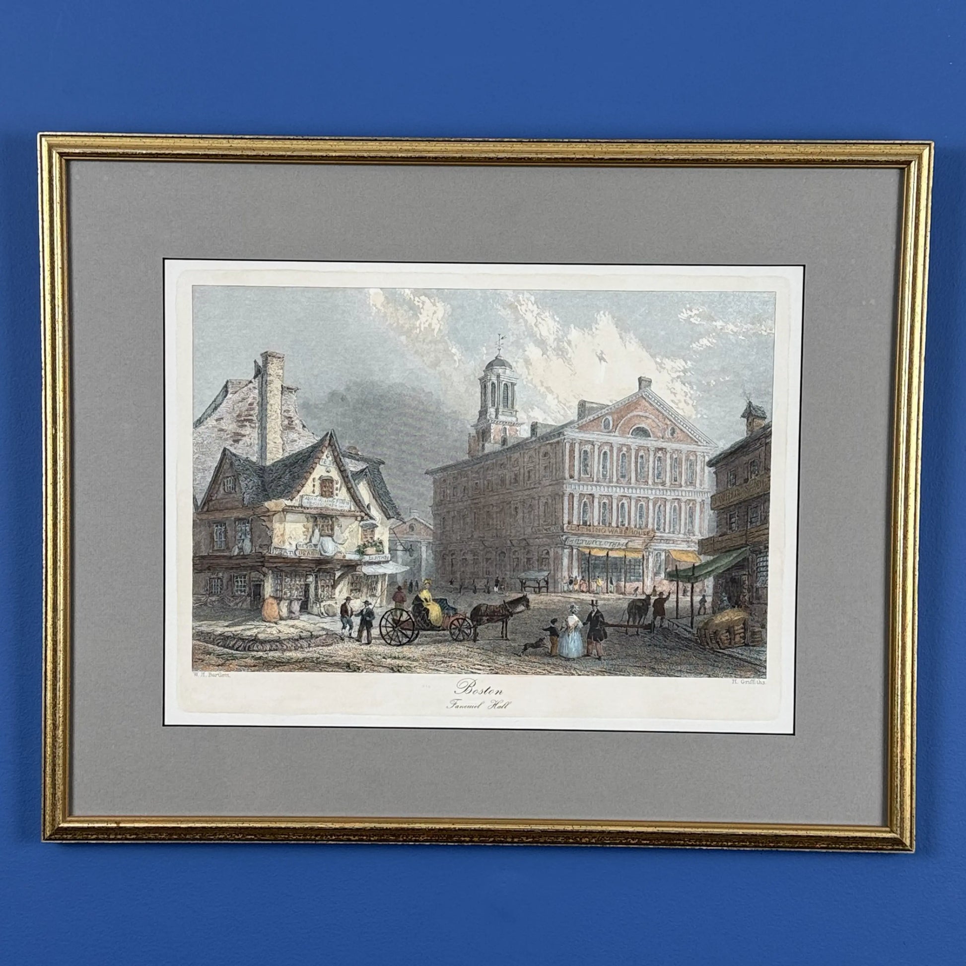 Framed restrike of engraving of Faneuil Hall (19th century) — Hand colored — With historical document