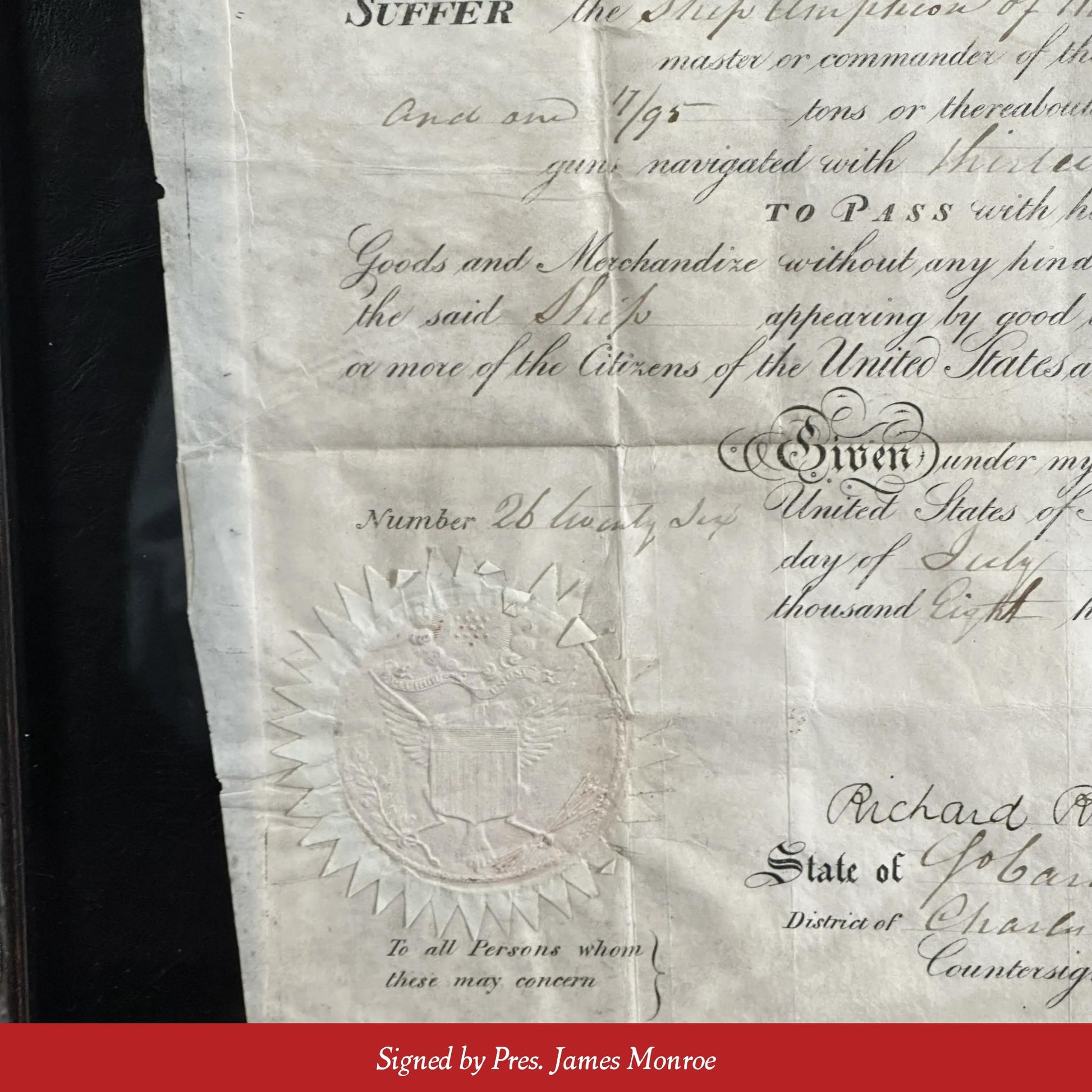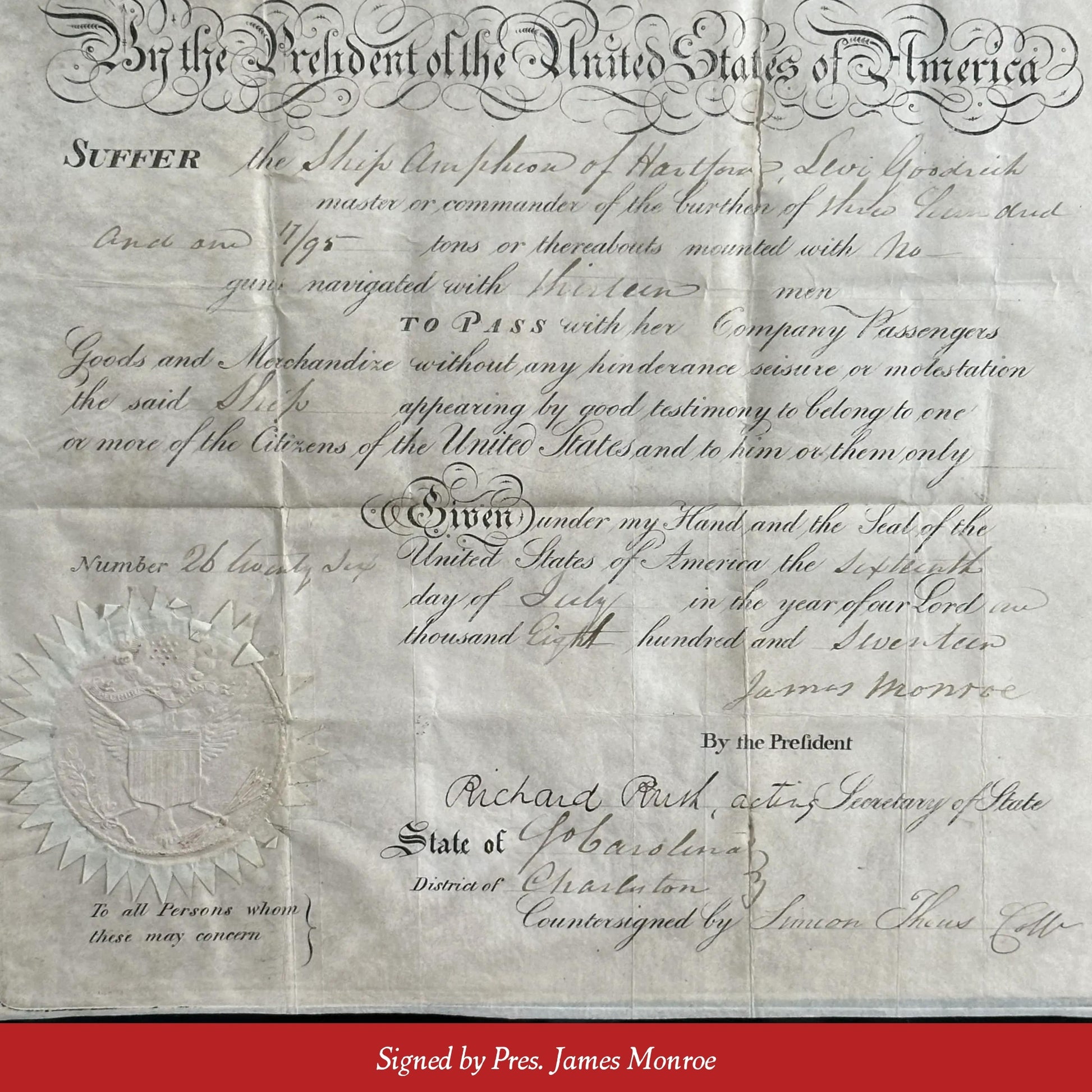 Engraved ship's passport signed by President James Monroe and acting Secretary of State Richard Rush on July 16, 1817. The one-page folio, printed on vellum, is Passport No. 26 issued in Charleston, South Carolina.