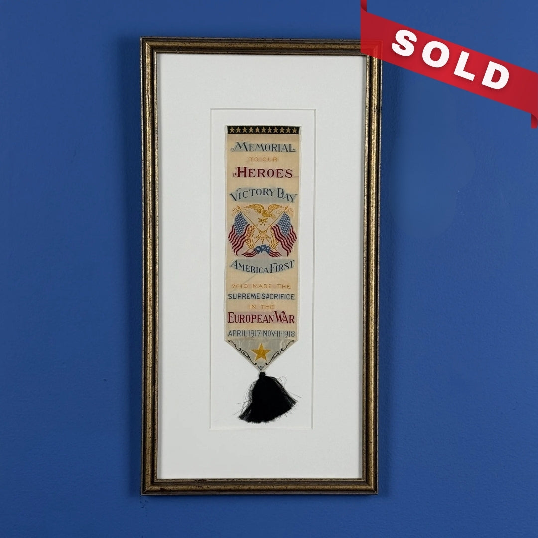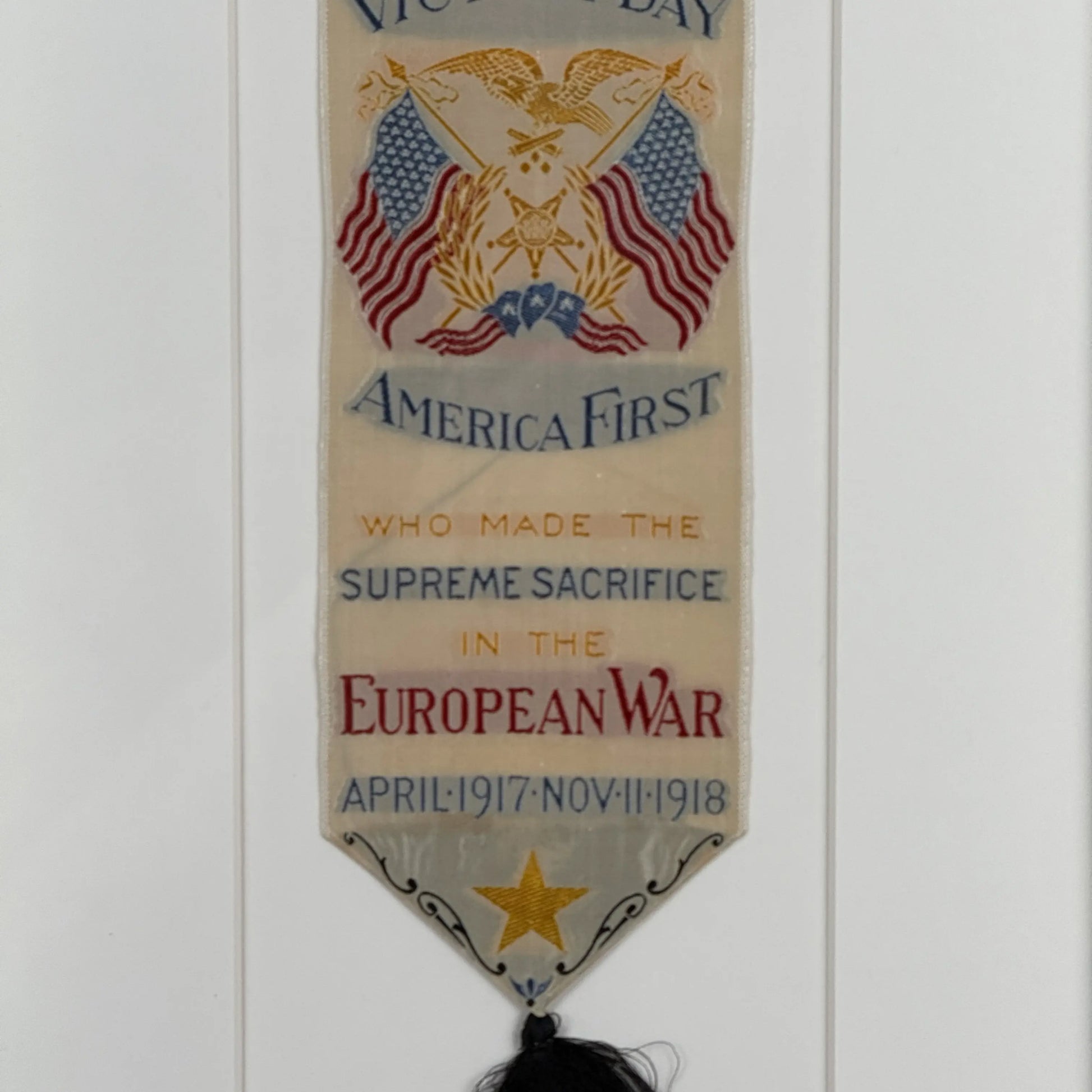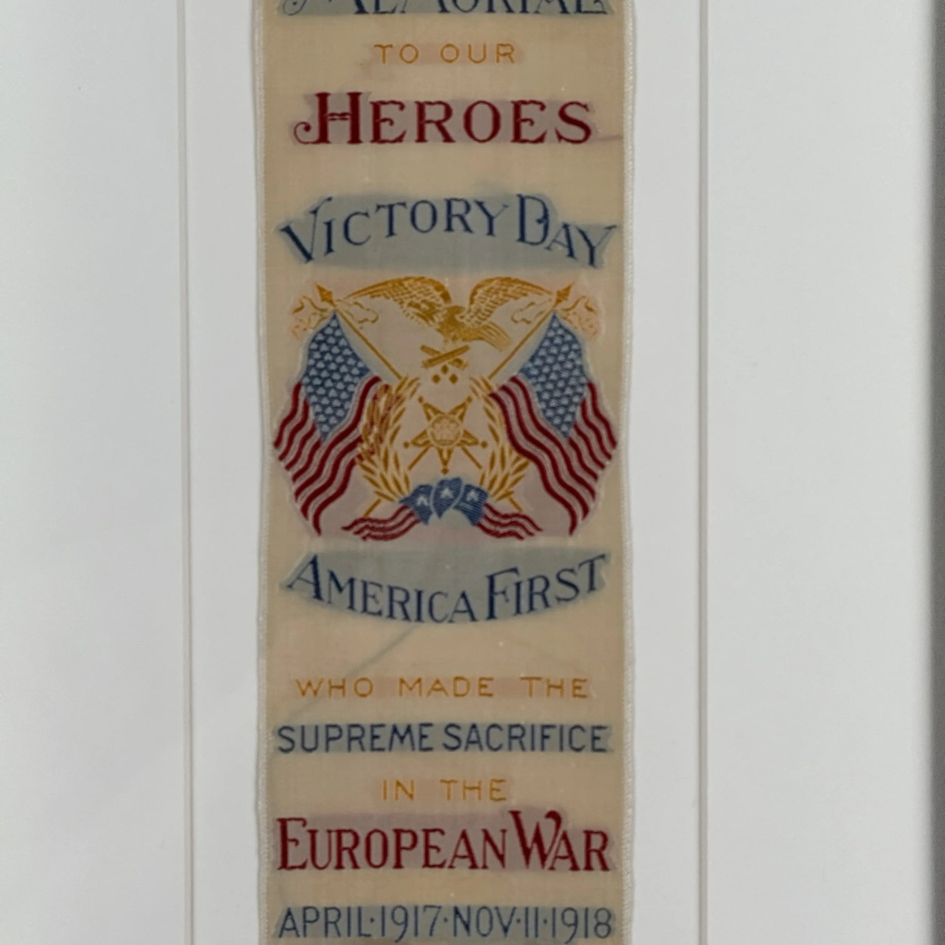 In like-new condition, a finely woven commemorative silk ribbon honoring the Americans who gave their lives in the First World War.