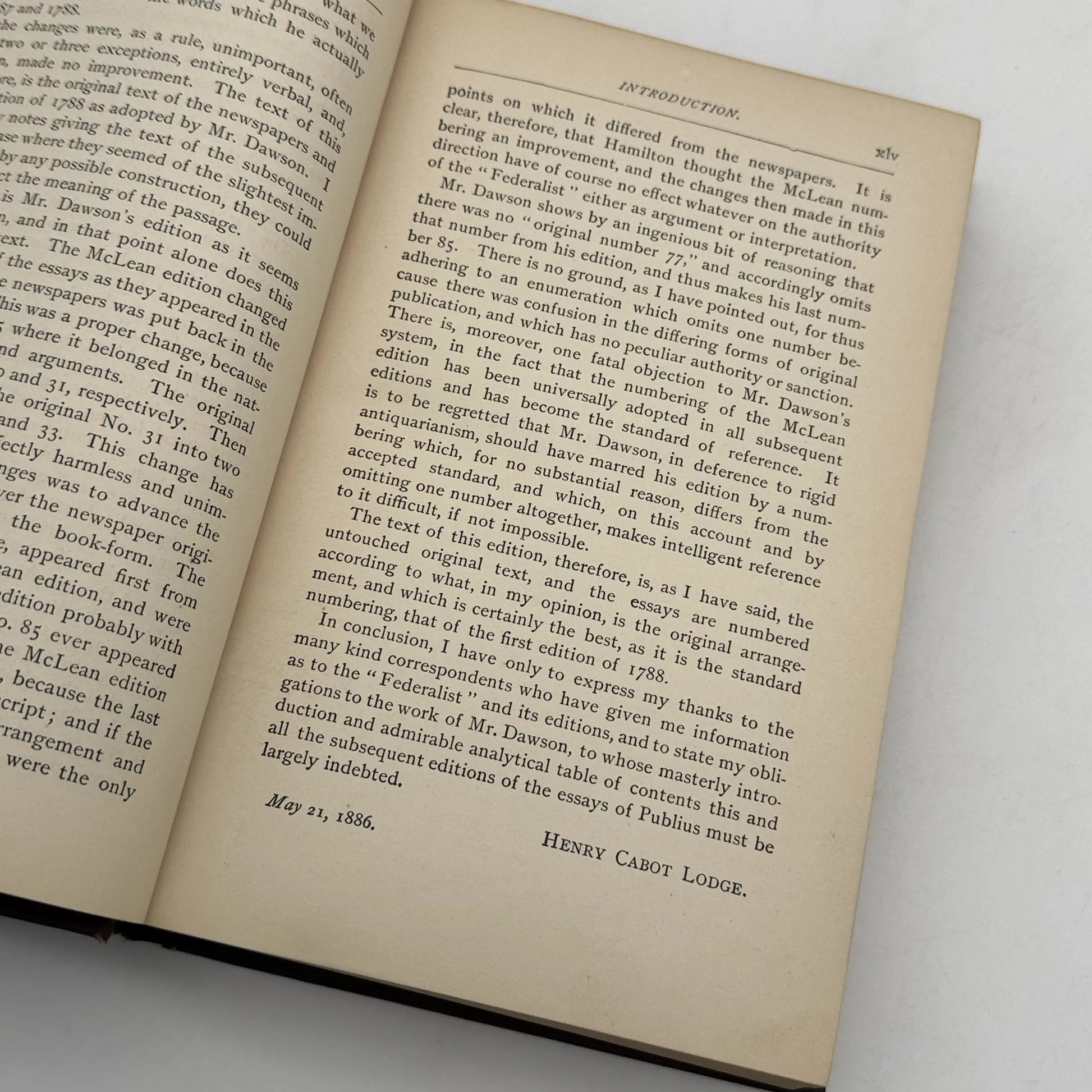 Full title: The Federalist. A Commentary on the Constitution of the United States Being a Collection of Essays Written in Support of the Constitution Agreed Upon September 17, 1887 By The Federal Convention. Reprinted from the Original Text of Alexander Hamilton, John Jay, and James Madison. Edited by Henry Cabot Lodge. Published in New York by G.P. Putnam's Sons, The Knickerbocker Press in 1899. 586pp.