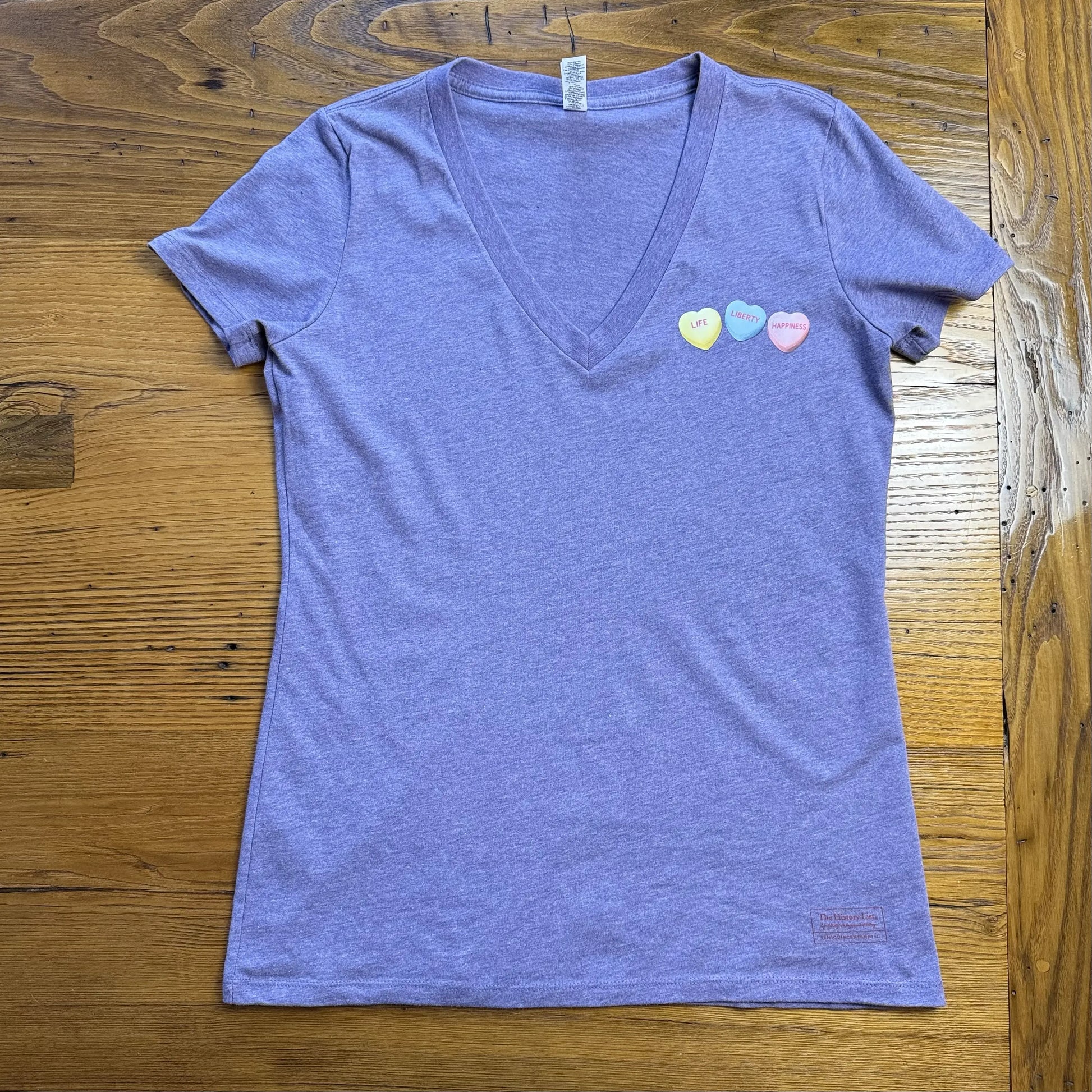 On the front over the left chest, three candies with the words, LIFE, LIBERTY, HAPPINESS.