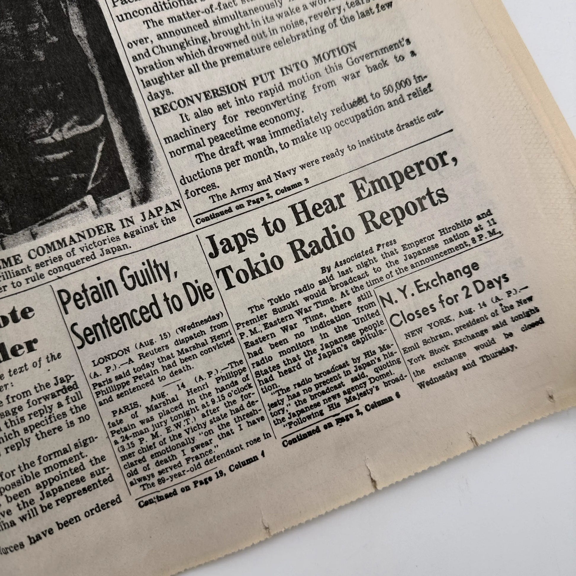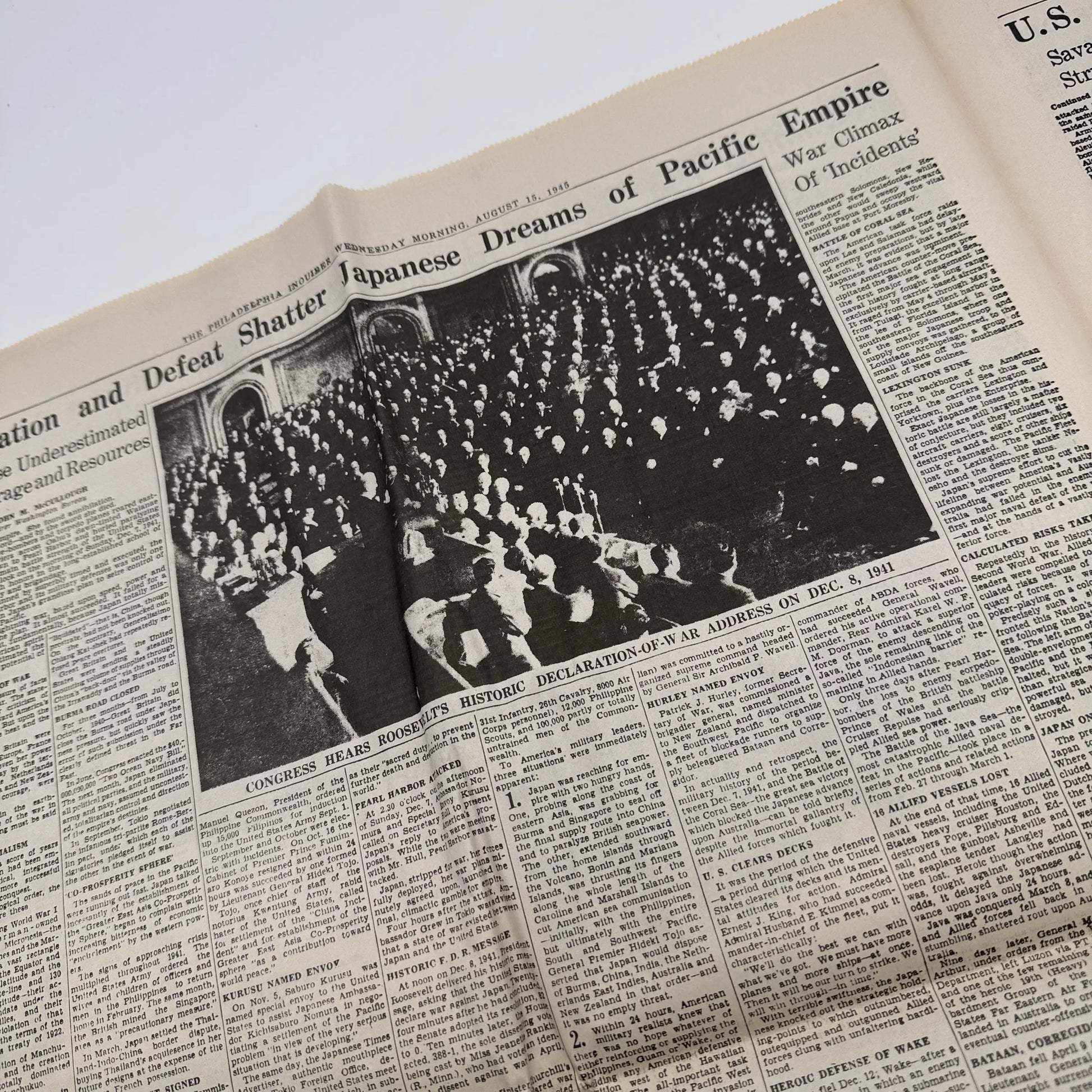 Three complete newspapers marking the three pivotal events in America's involvement in WWII, one original (I think) and two reprints (I know). Priced accordingly.