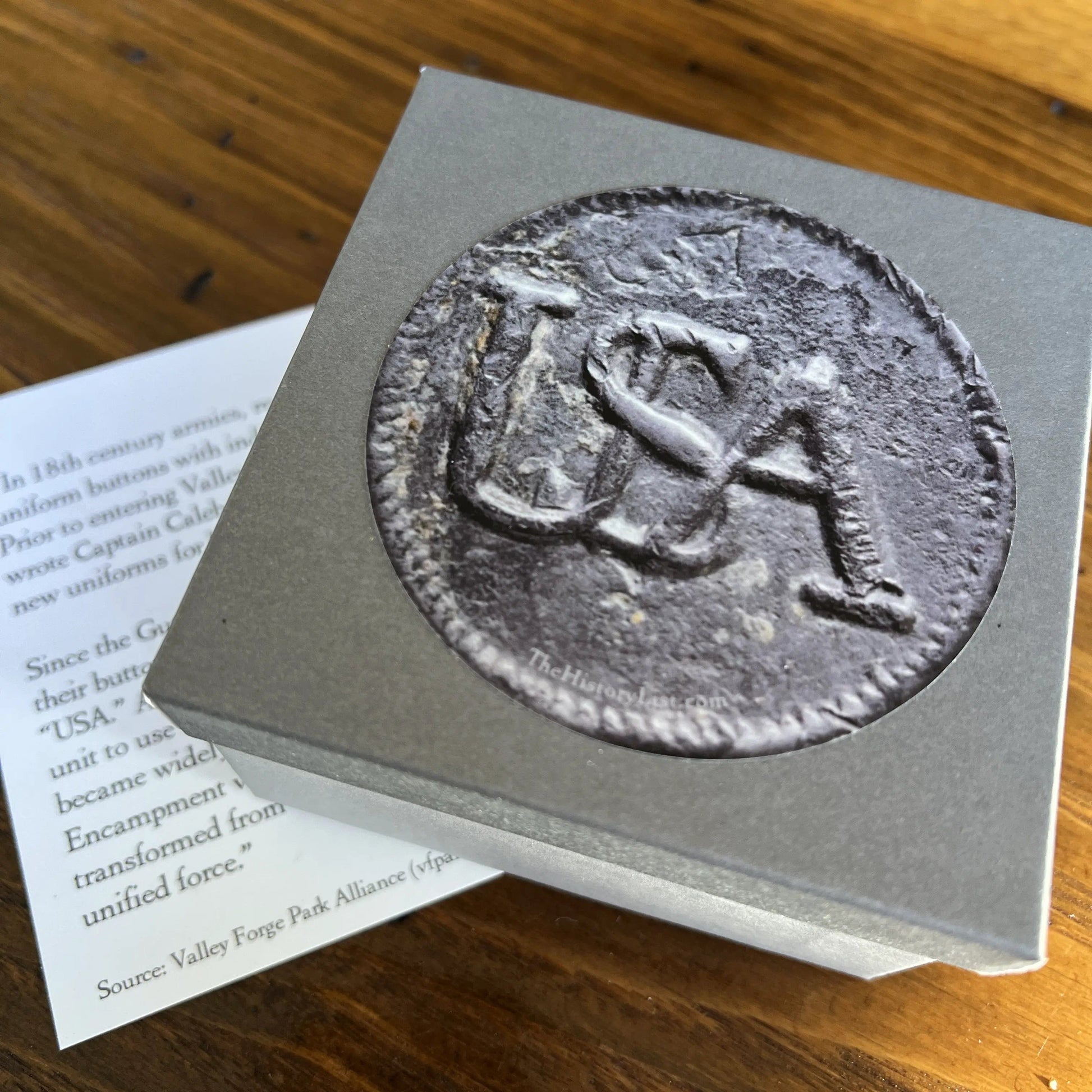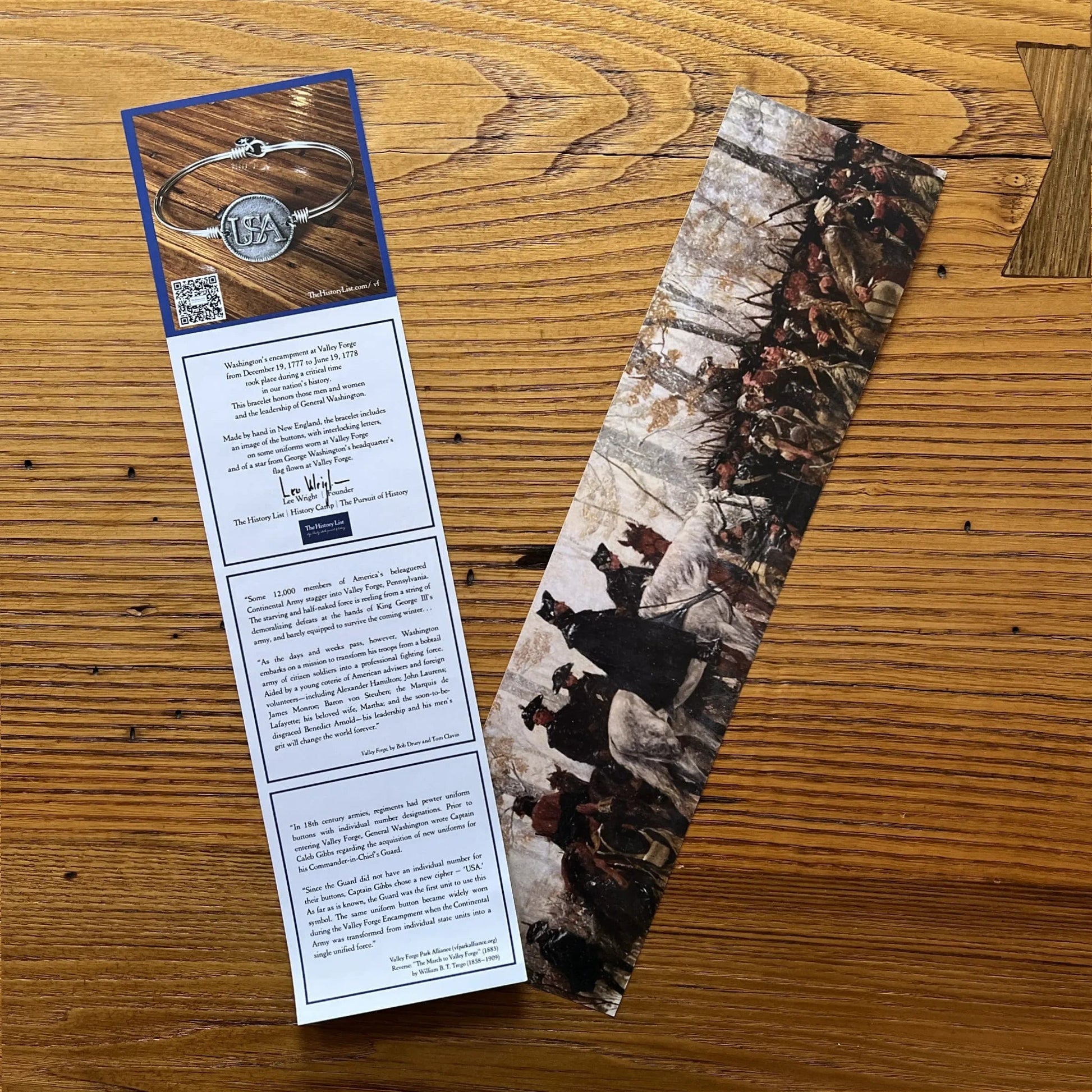 Includes a small print with an explanation of the symbols shown on the bracelet and its historical significance. On the back, a famous painting of George Washington on Valley Forge.