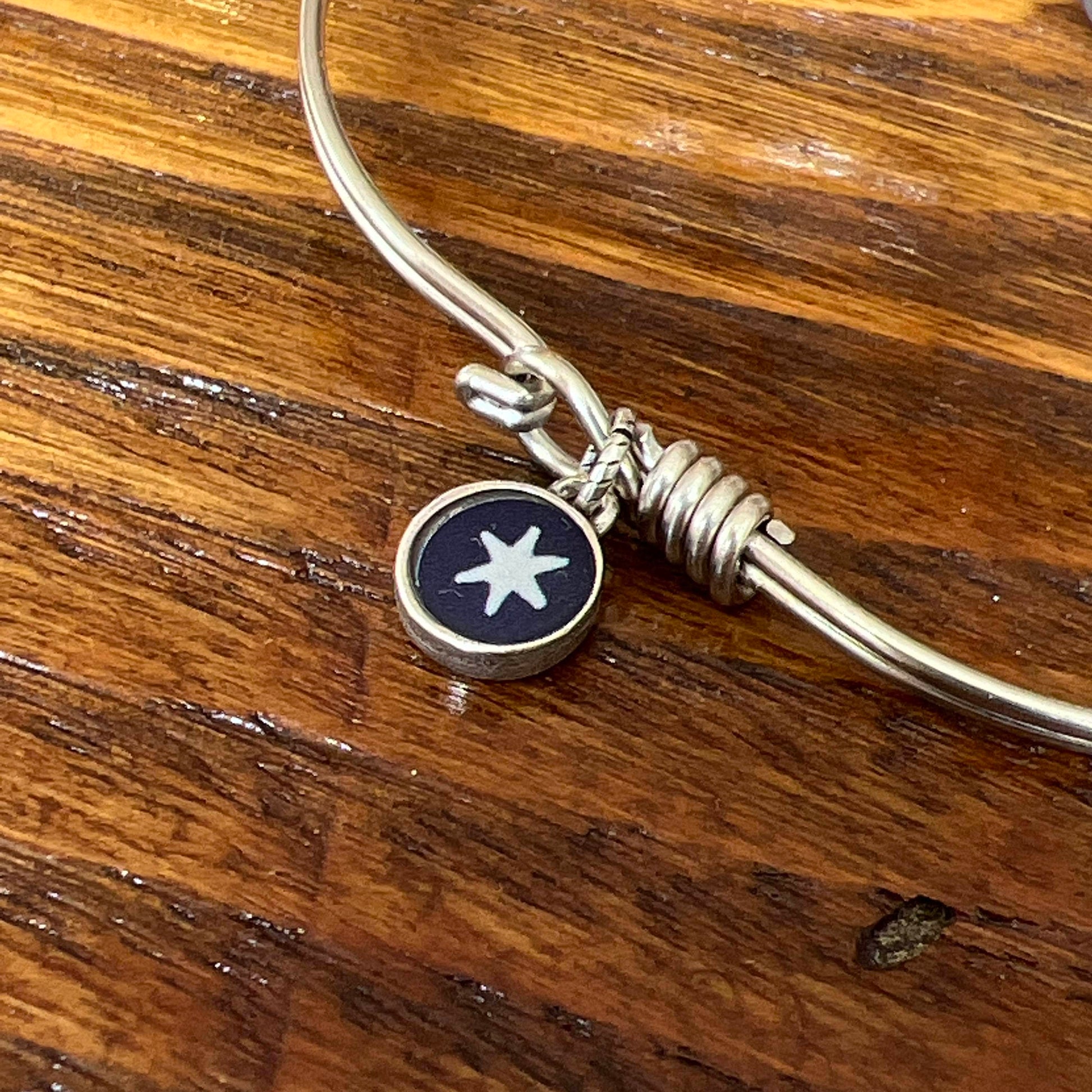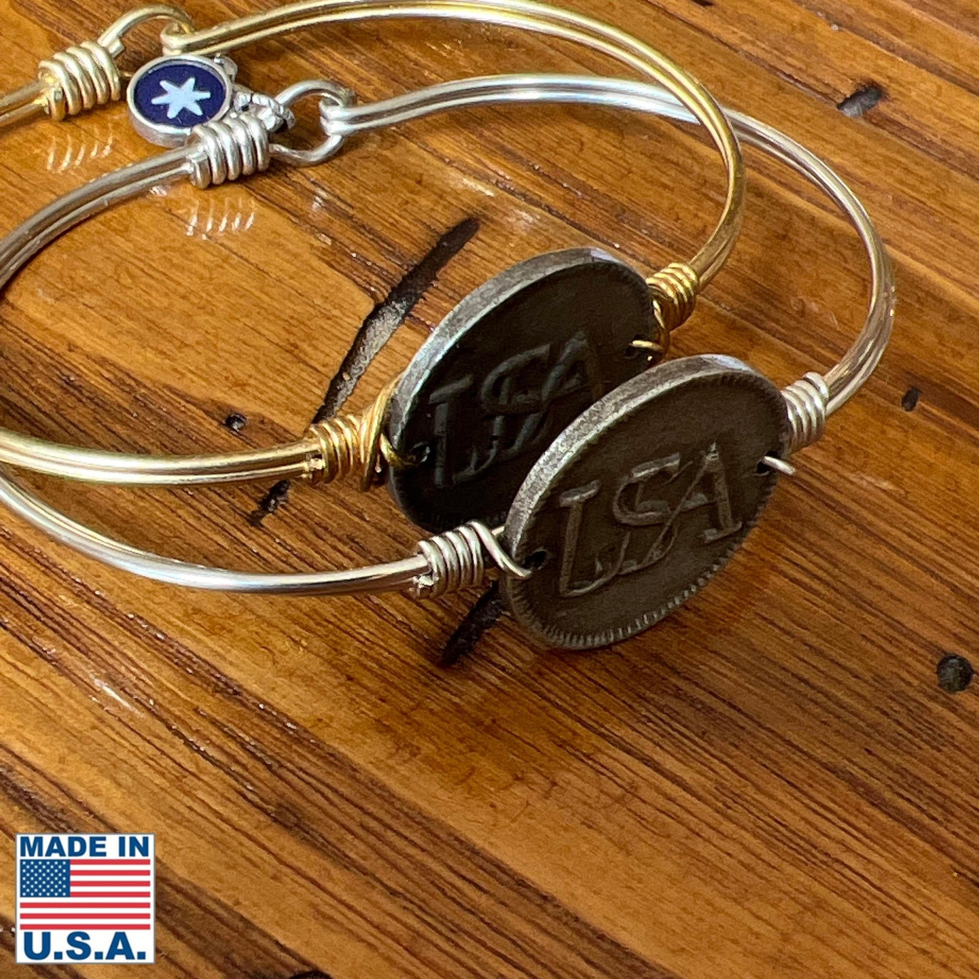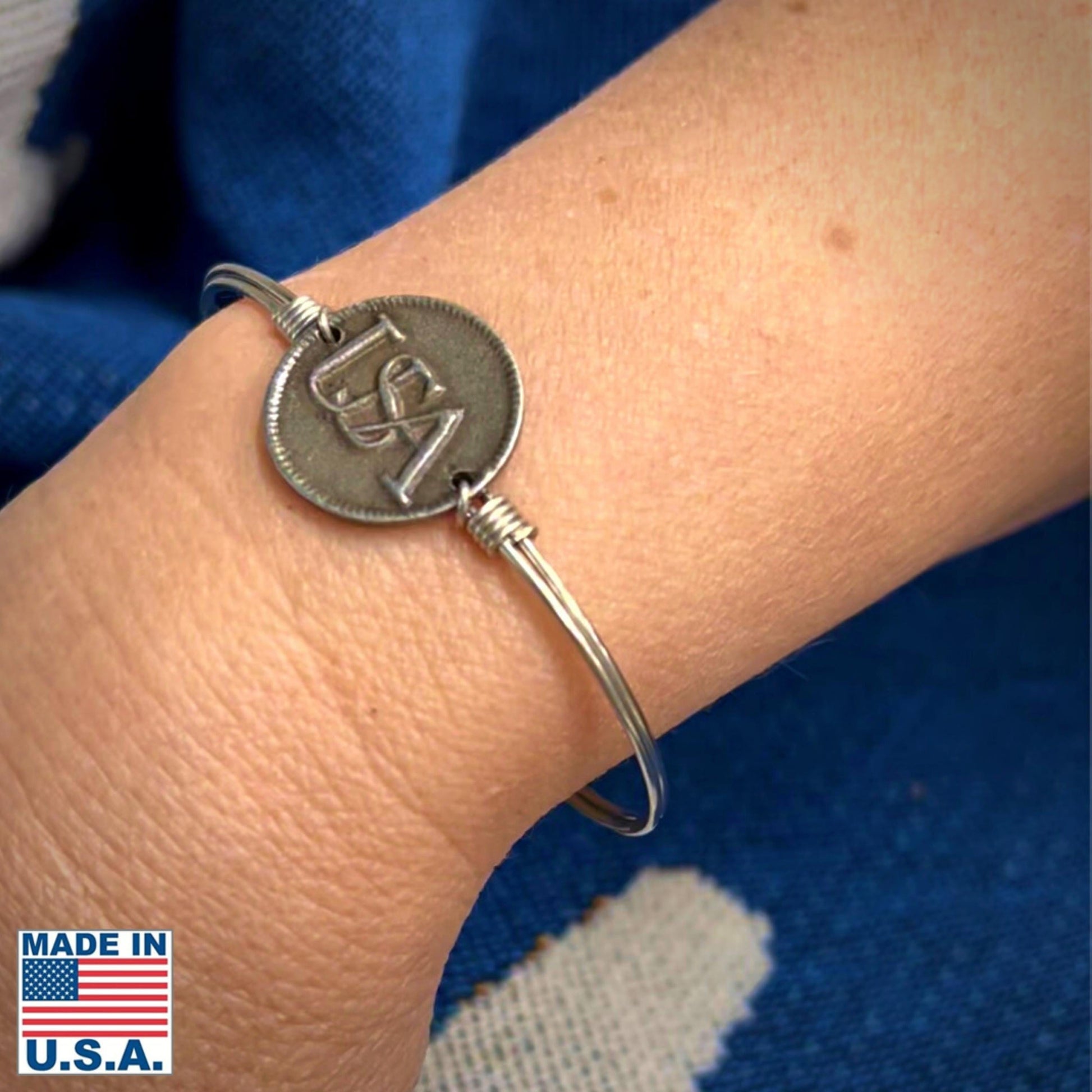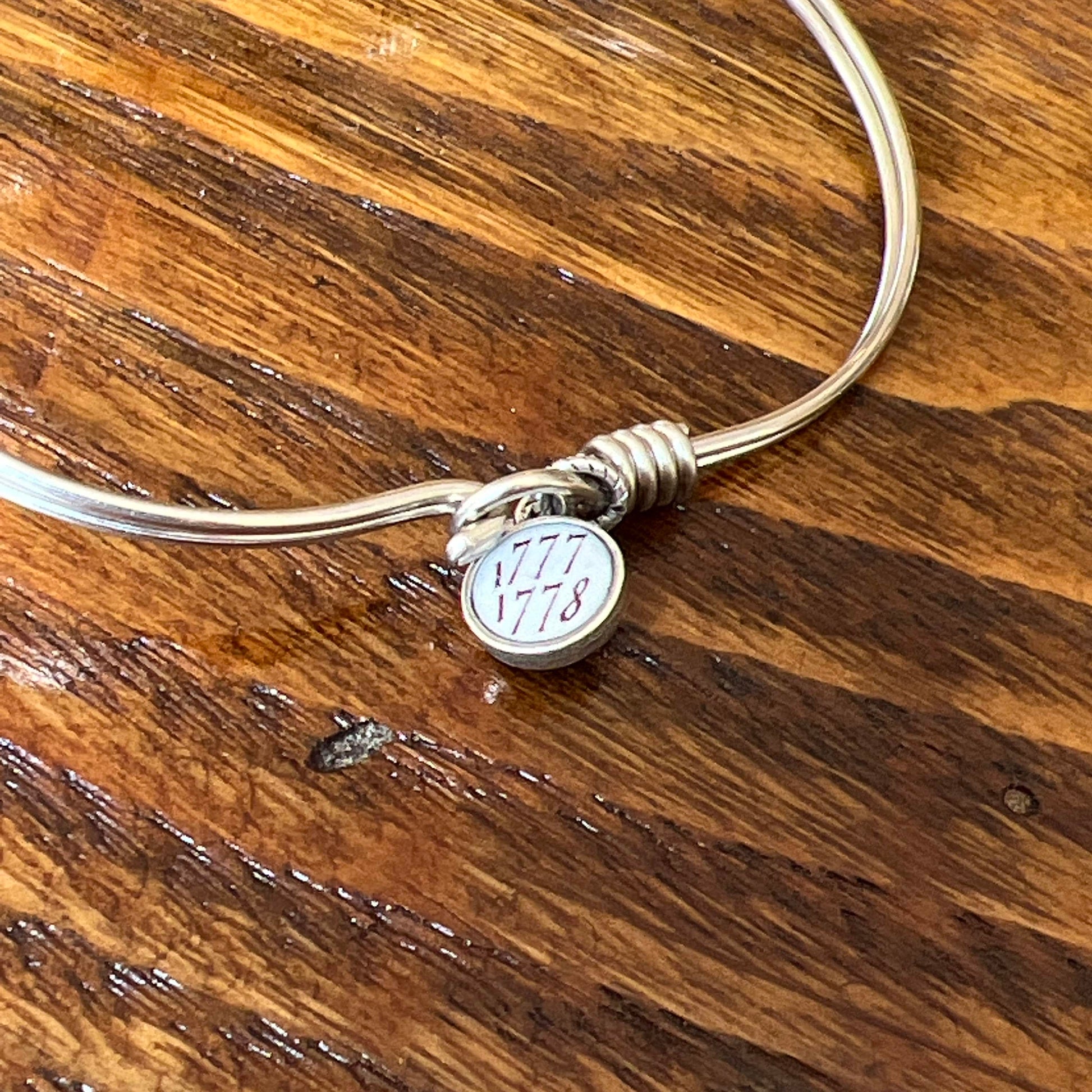 The historic Continental army "USA" button recreated in a medallion with a wire-wrapped bracelet, and a smaller charm at the clasp with a star from George Washington's Headquarters flag on one side and the years of the encampment, 1777 - 1778, on the reverse. Our exclusive design. Made by hand in New England.