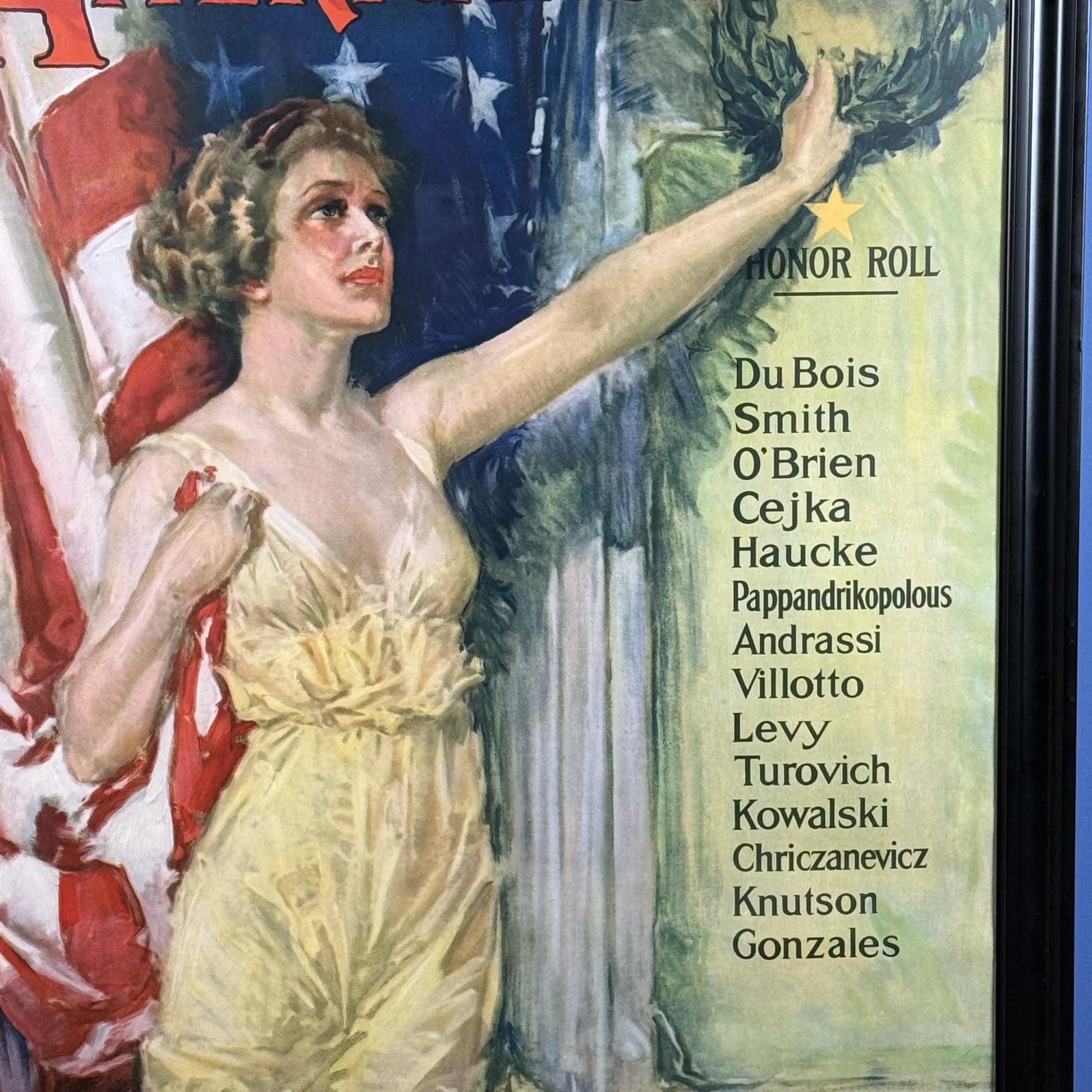 Created by artist Howard Chandler Christy in 1919 featuring an allegorical female figure of America, standing in front of American flag, holding wreath over "Honor roll" consisting of last names from different origins.