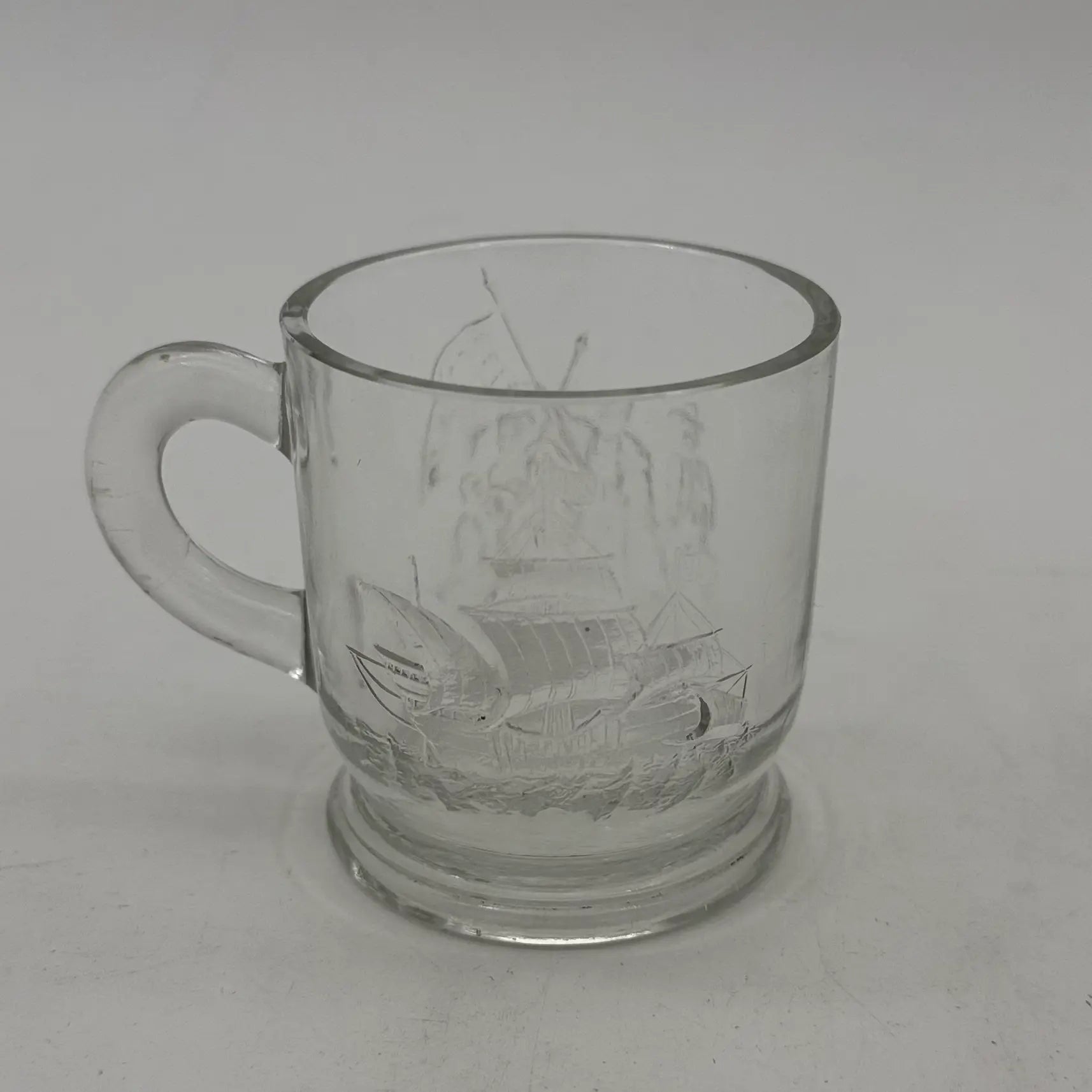 Clear hand-pressed glass cup with handle with an image from John Vanderlyn's painting, Landing of Columbus on one side and Santa Maria, the largest of the three small ships used by Christopher Columbus in his first expedition across the Atlantic Ocean in 1492, on the other side.