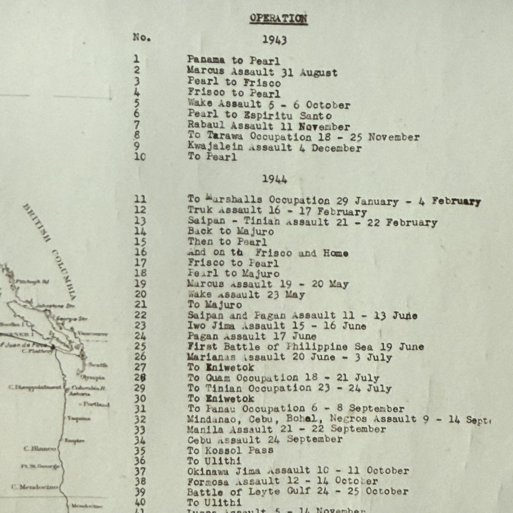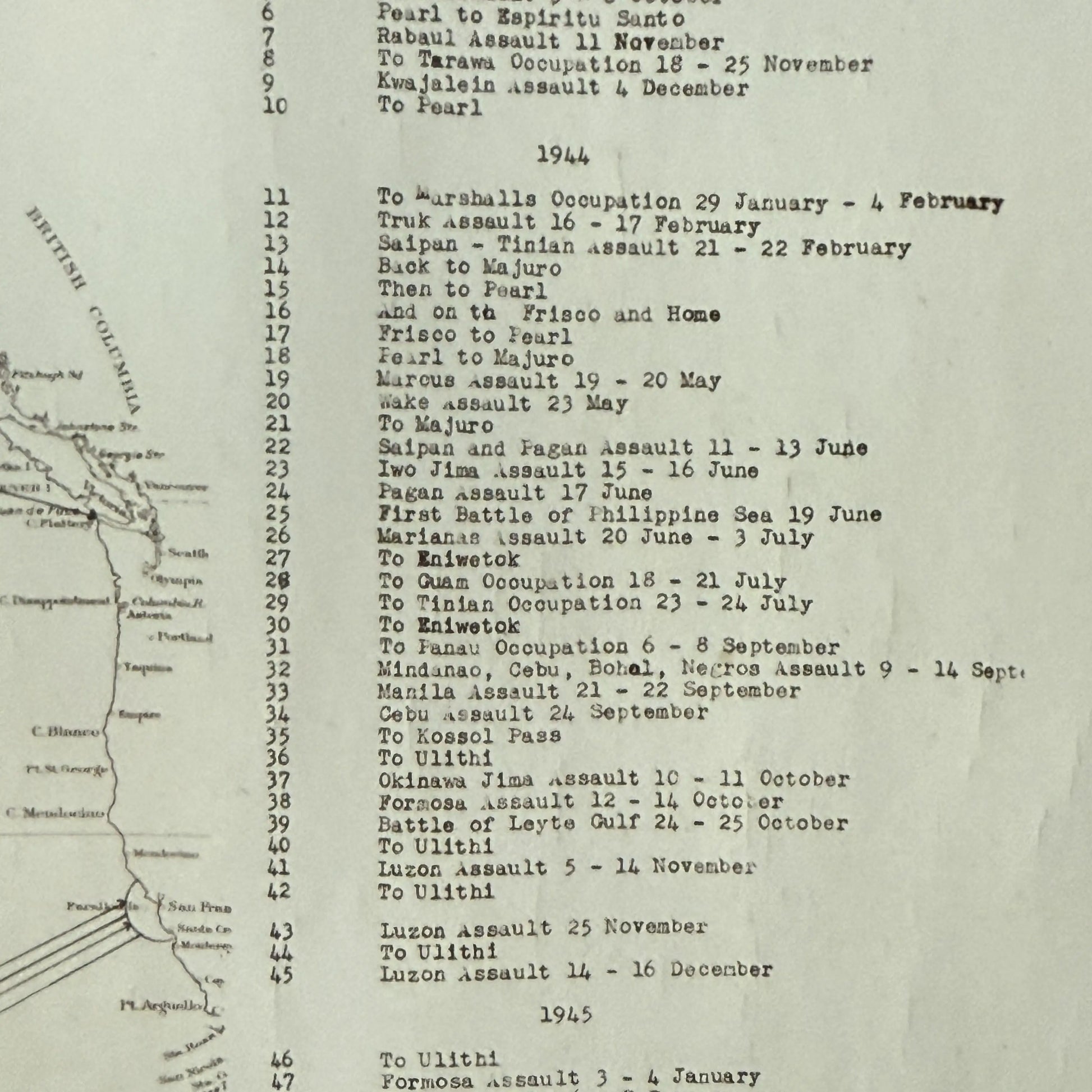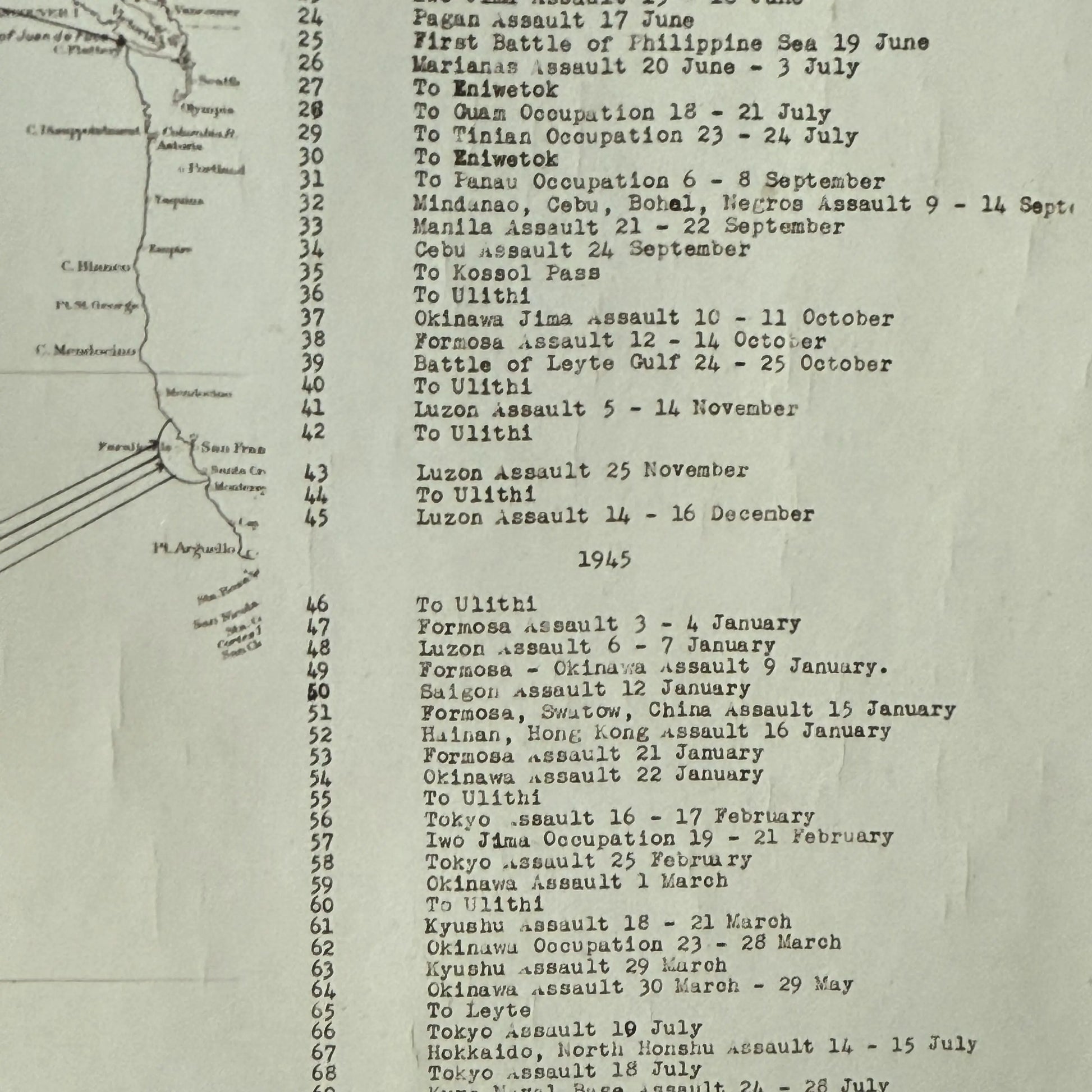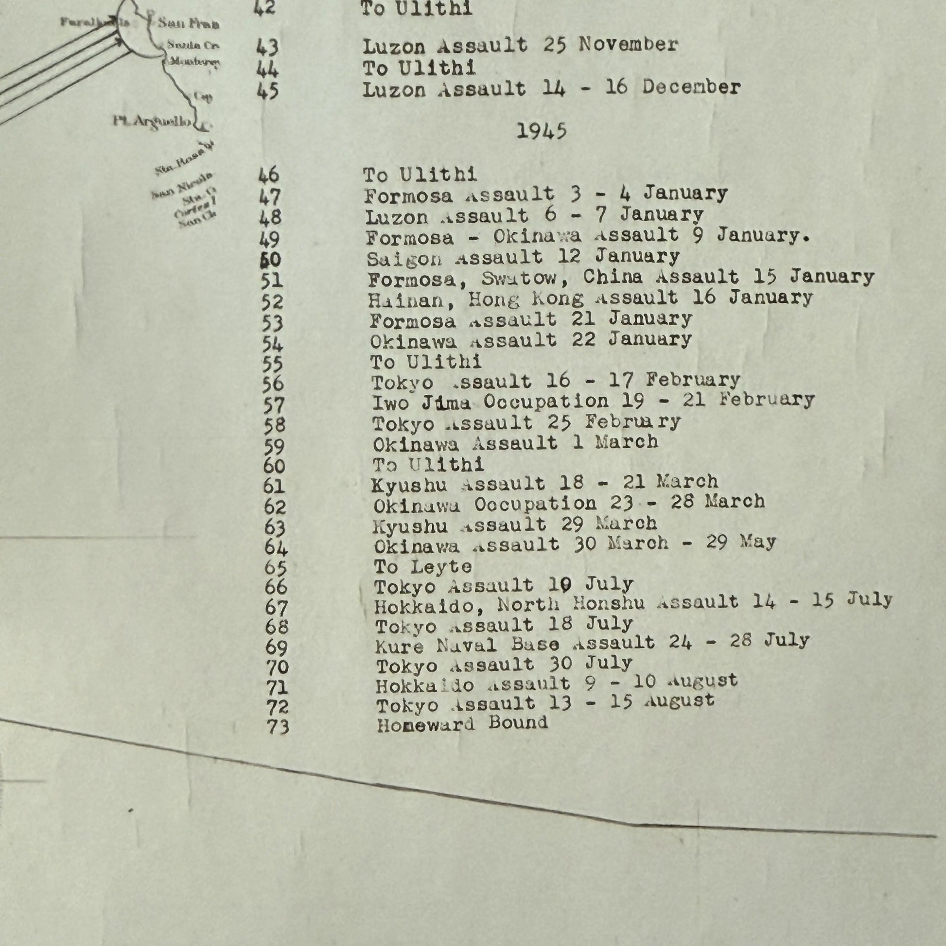 It shows the path of the ship's travel and includes a key that identifies 73 events that took place along its route. Also includes photographs of the carrier in action.